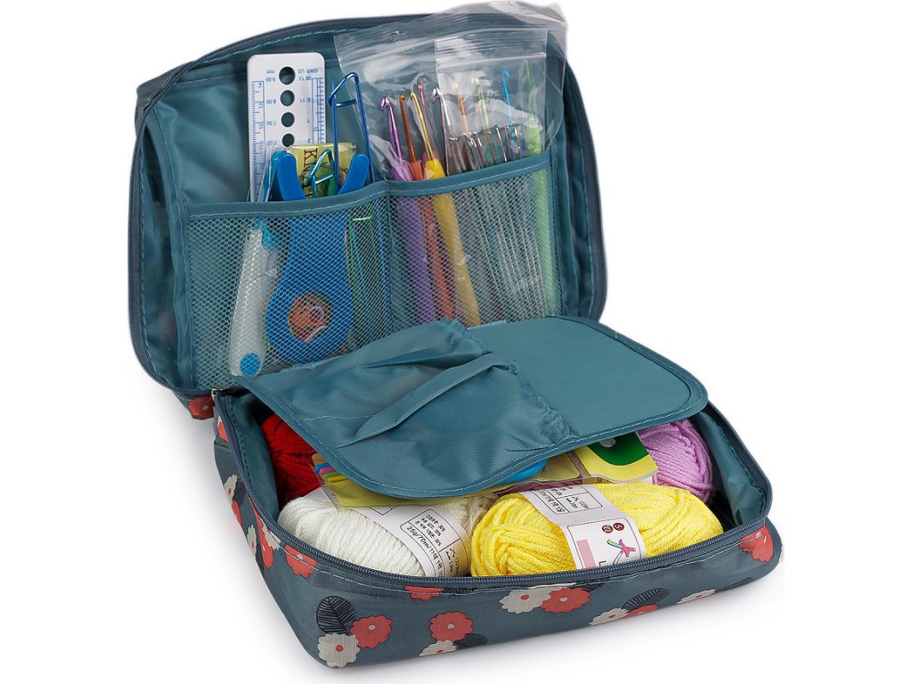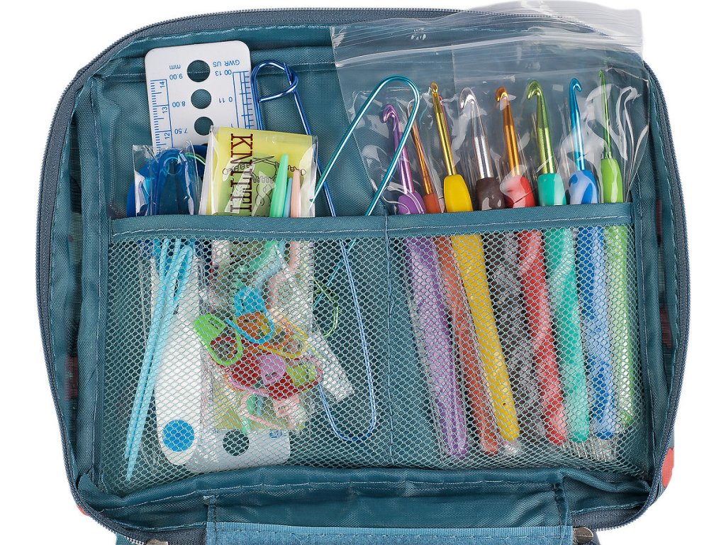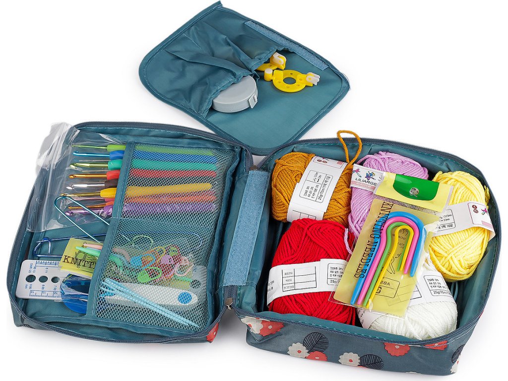 Sada háčků a pomůcek na háčkování je uložená v textilním pouzdře, které můžete snadno uzavřít pomocí zipu. Praktické pouzdro umožňuje snadnou organizaci a přenášení, ať už pracujete doma nebo na cestách. Sada obsahuje 12 stříbrných kovových háčků následujících velikostí: 0,6; 0,75; 0,85; 0,9; 1; 1,1; 1,3; 1,4; 1,5; 1,6; 1,75; 1,9; a 9 barevných hliníkových háčků se silikonovou rukojetí velikosti: 2; 2,5; 3; 3,5; 4; 4,5; 5; 5,5; 6. Dále pak nůžky cvakačky, pravítko, sadu pomocných spínacích špendlíků, sadu plastových pomocných jehlic, sadu plastových jehel, zavírací hliníkové jehlice, oboustranný krejčovský metr (150 cm, 60 inch), bambulkovač, 5 barevných přízí a pomůcku na namotání příze. Celkem je v sadě cca 57 ks pomůcek.