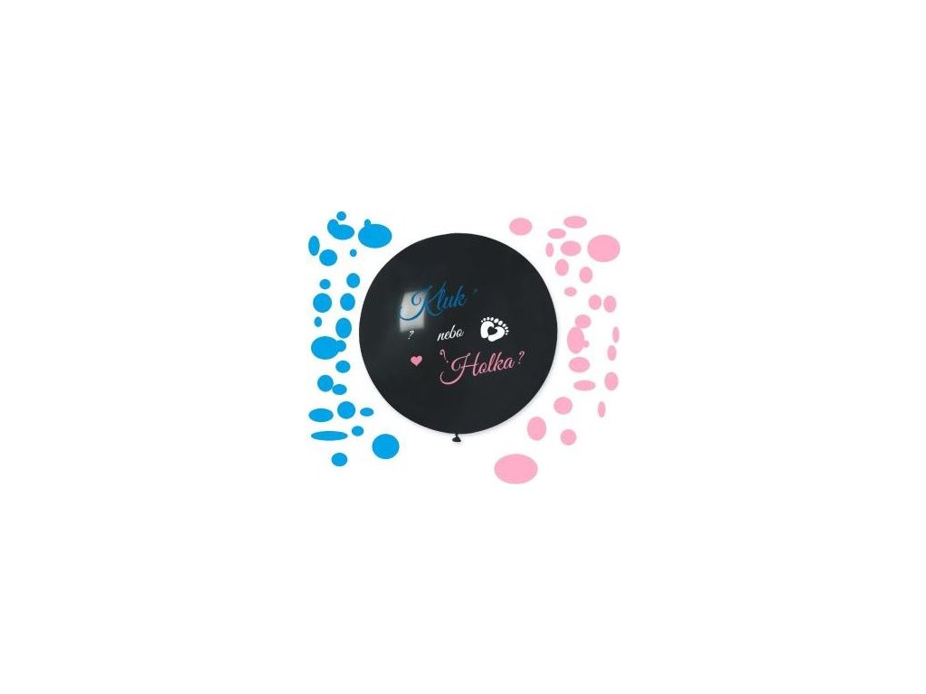 Sada obsahuje jeden černý balónek 80 cm s nápisem "Kluk nebo holka?" a růžové i modré konfety, kterými naplníte balón podle toho, jestli se narodí holčička nebo chlapeček.