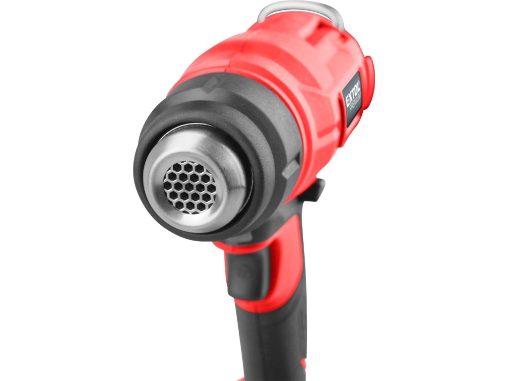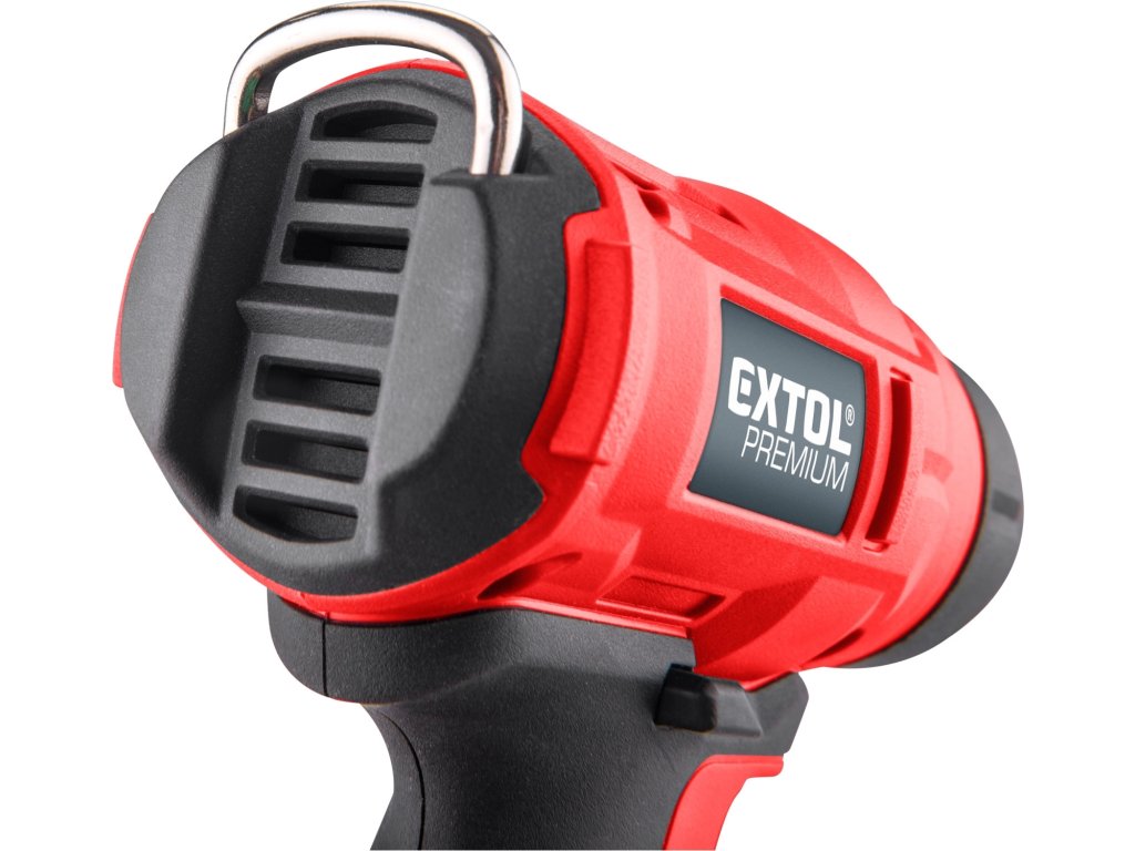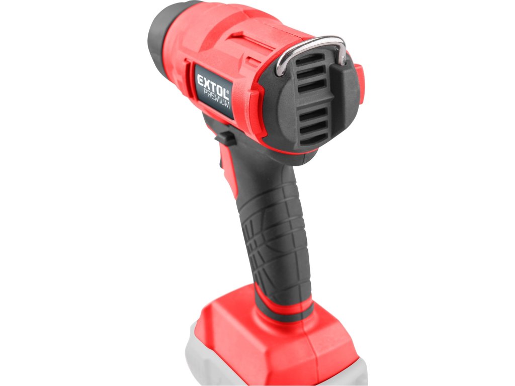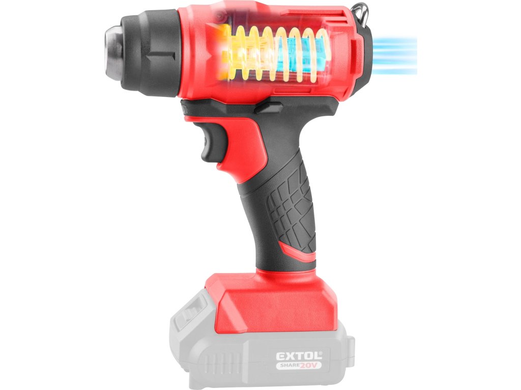 Aku horkovzdušná pistole s teplotou vzduchu až 550°C je určena k tvarování, smršťování a spojování umělých hmot, k ohýbání plastových trubek, k uvolňování lepených spojů, dále k rozmrazování zamrzlého potrubí, k odstranění mechu a plevelů ve spárách dlažby, k zapalování grilovacího uhlí, sušení atd. V malém rozsahu lze použít také na odstraňování starých barev a laků. Pistole se nahřeje na provozní teplotu za 5 vteřin od zapnutí díky elektronickému řízení nahřívání. Pro zvýšení životnosti stroje, ventilátor pracuje ještě několik vteřin po uvolnění spínače, aby ochladil topnou spirálu. Pistole je vybaven LED svítilnou, která osvětluje pracovní prostor při práci a háčkem na zavěšení. Součástí dodávky jsou tři vyměnitelné trysky – redukční tryska (úzký proud vzduchu): pro koncentrování proudu vzduchu (tepla) do malého místa, např. pro pájení či ohýbání plexiskla, široká tryska: pro nahřívání širší plochy, trubková tryska: pro nahřívání trubek. Díky integrovanému snímacímu prstenci lze z pistole rychle sejmout horkou koncovku a vyměnit ji za jinou bez vyčkávání na zchladnutí nebo bez použití kleští. Pro běžnou práci dostačují jeden nebo dva 2000mAh akumulátory, které můžete rychle nabít v rychlonabíječce, pro náročnější nebo delší práci doporučujeme větší akumulátory s kapacitou 4000–8000mAh. Akumulátor lze použít ve všech typech nářadí řady EXTOL SHARE20V. Díky použité Li-ion technologii je ho možné kdykoliv dobíjet, aniž by se tím snižovala jeho kapacita. Li-ion akumulátor ztrácí energii vlivem samovybíjení velmi pomalu a vydrží dlouho nabitý a připravený k použití.