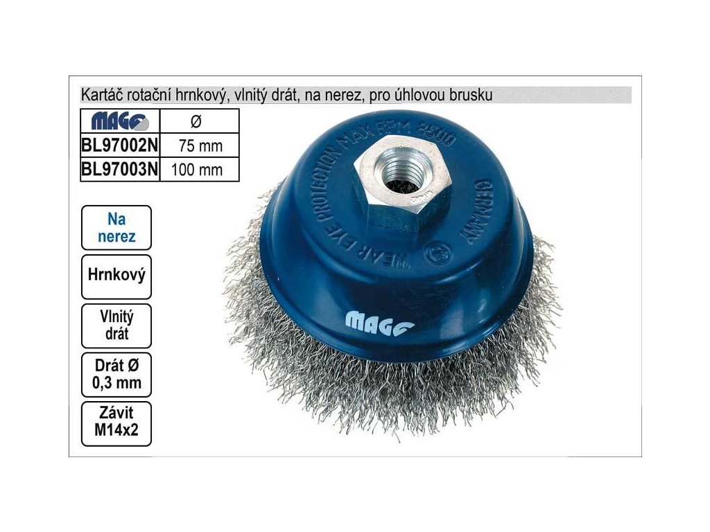 Kartáč rotační na nerez hrnkový 100mm vlnitý drát pro úhlovou brusku