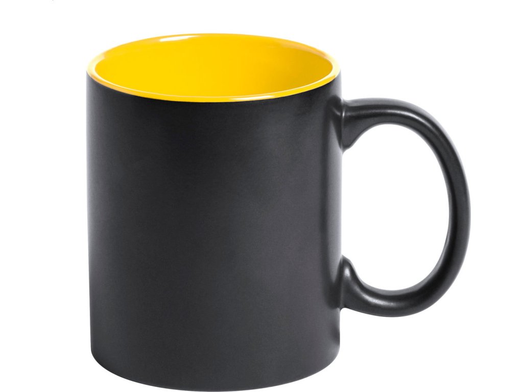 Černý keramický hrnek s barevným vnitřkem, 350 ml. Speciální povrch pro laser, kdy vygravírované logo má stejnou barvu jako vnitřek hrnku. V dárkové krabičce.