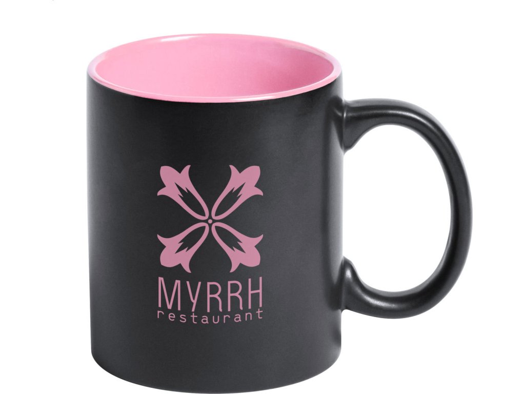 Černý keramický hrnek s barevným vnitřkem, 350 ml. Speciální povrch pro laser, kdy vygravírované logo má stejnou barvu jako vnitřek hrnku. V dárkové krabičce.