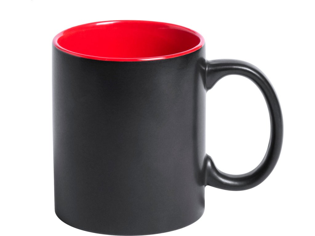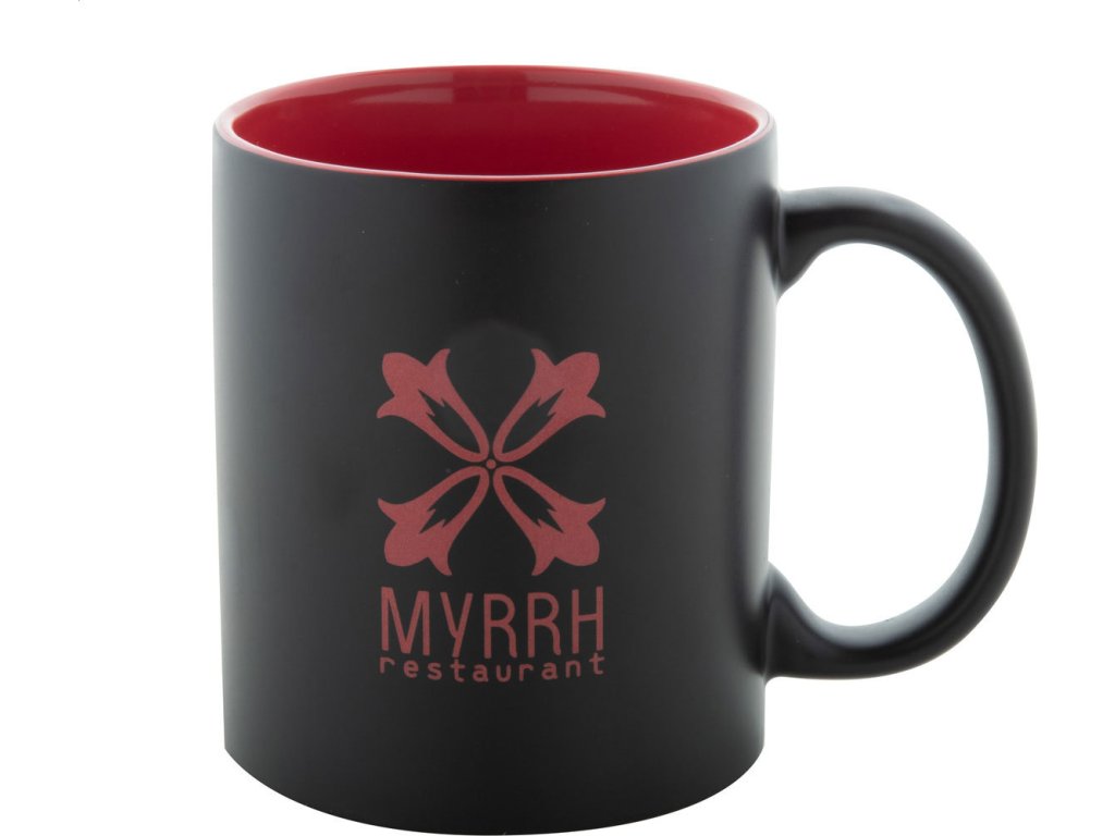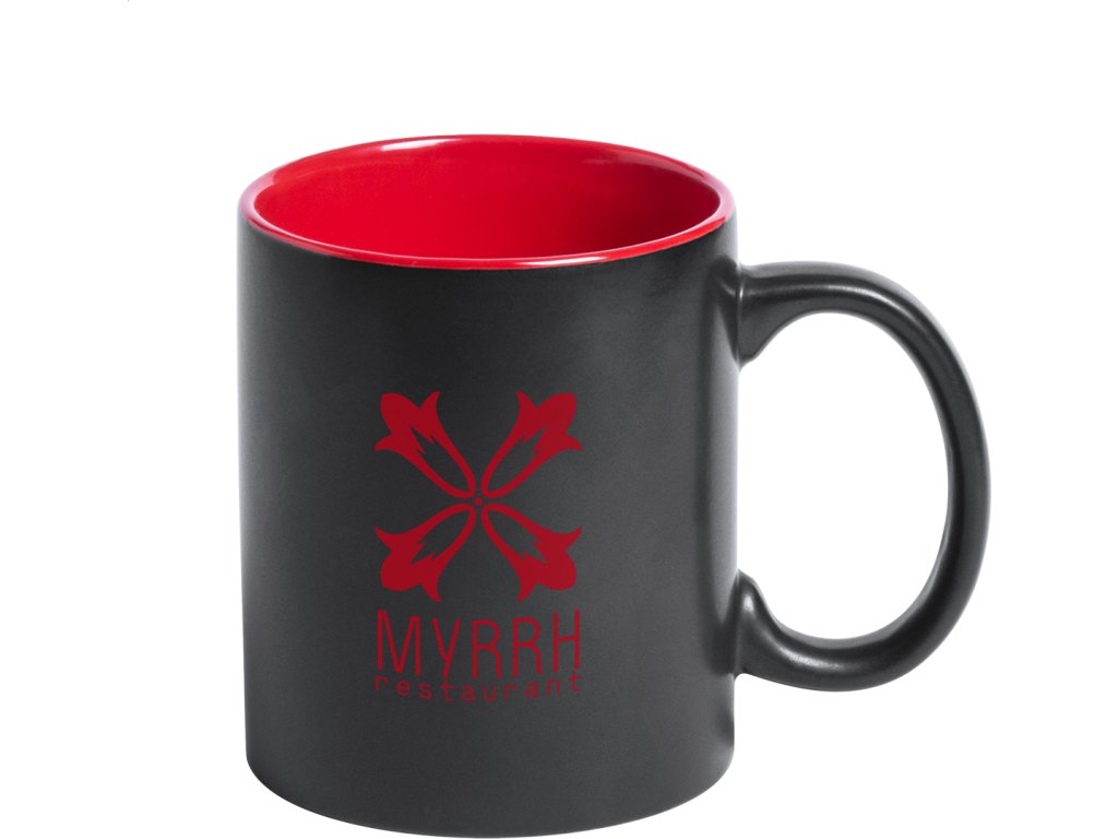 Černý keramický hrnek s barevným vnitřkem, 350 ml. Speciální povrch pro laser, kdy vygravírované logo má stejnou barvu jako vnitřek hrnku. V dárkové krabičce.