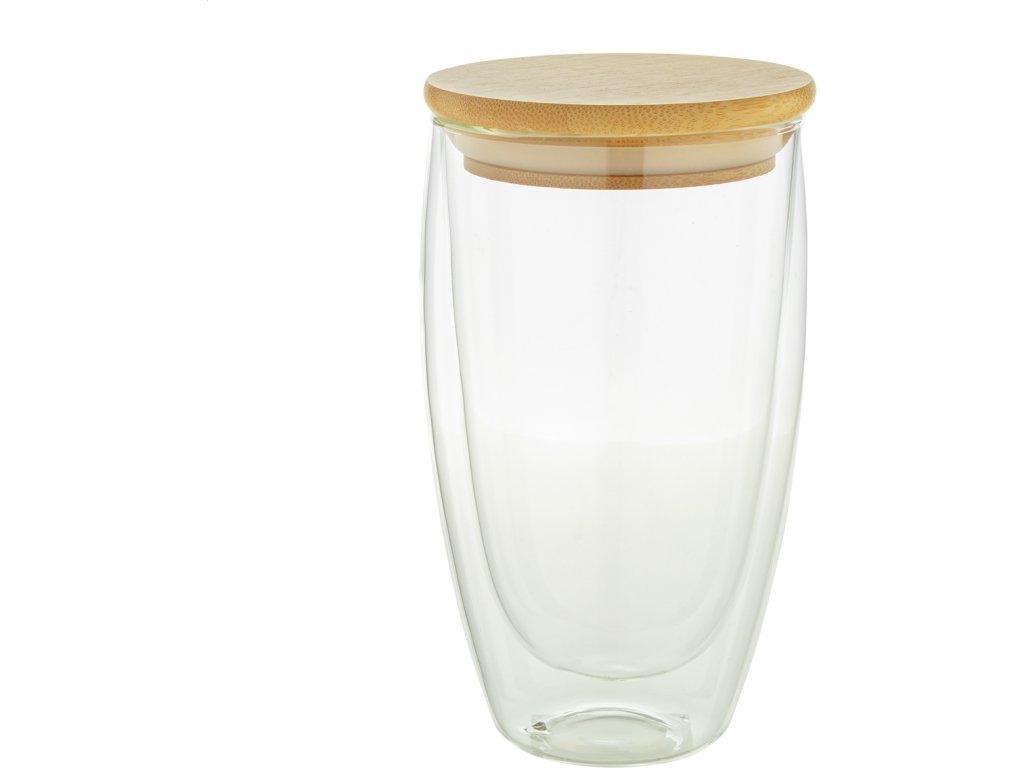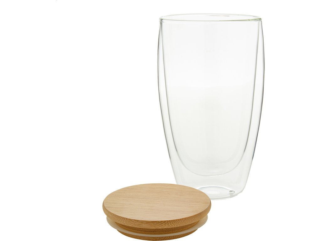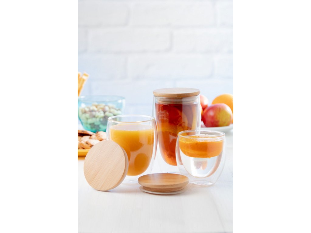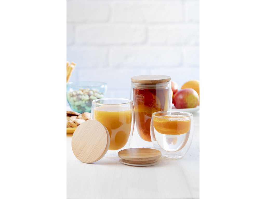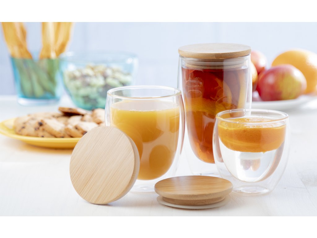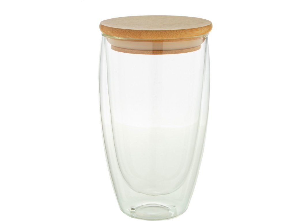 Dvoustěnný termohrnek z borosilikátového skla s bambusovým víčkem, 420 ml. V kraftové papírové krabici.