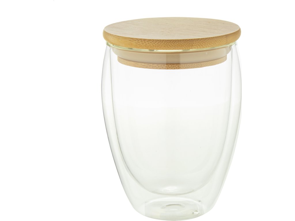 Dvoustěnný termohrnek z borosilikátového skla s bambusovým víčkem, 320 ml. V kraftové papírové krabici.
