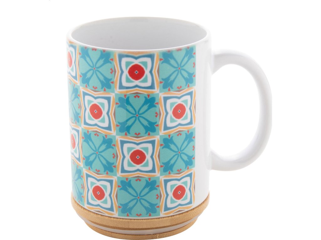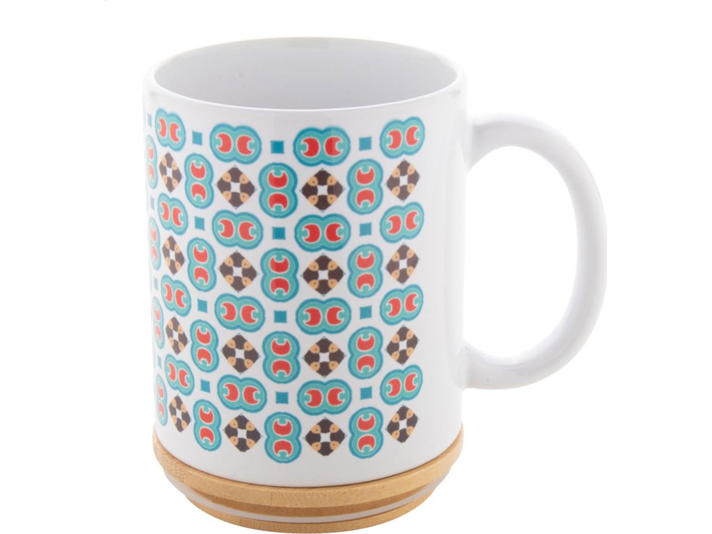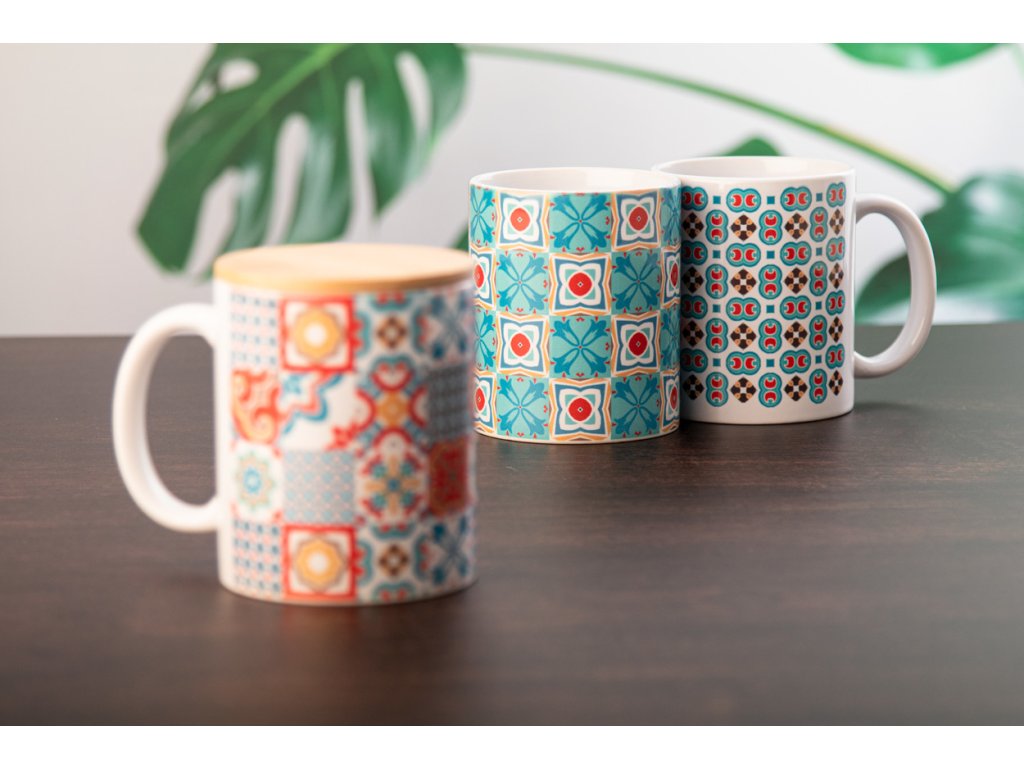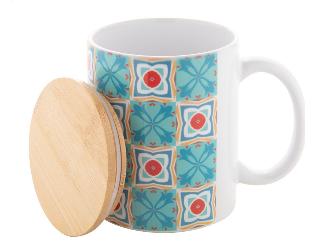 Bílý keramický hrnek s bambusovým víčkem pro sublimační potisk vhodný do myčky na nádobí, 300 ml. V kraftové papírové krabici.