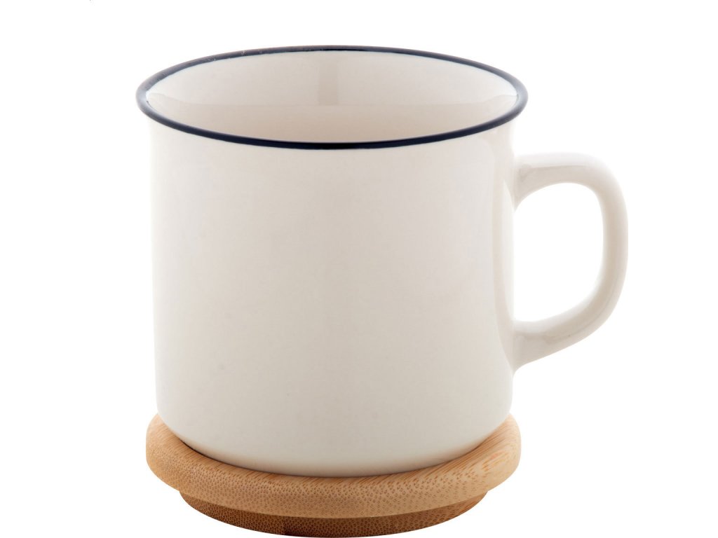 Vysoce kvalitní porcelánový retro hrnek v bílé barvě s černým okrajem a bambusovým podtáckem, 320 ml. V dárkové krabičce.