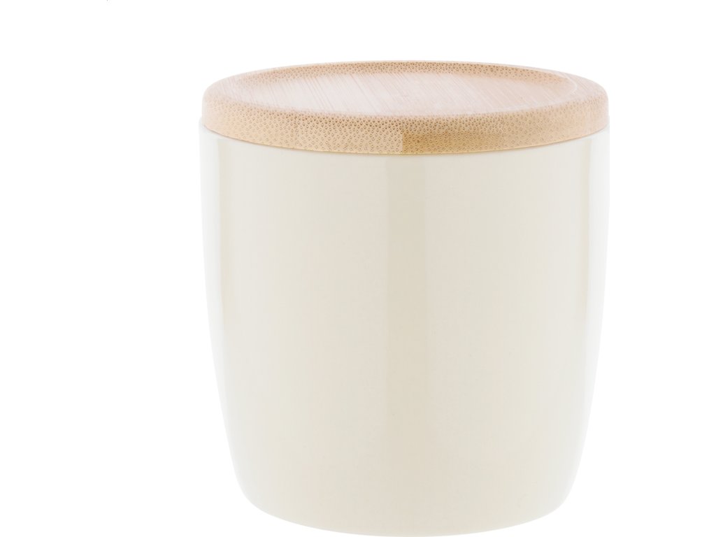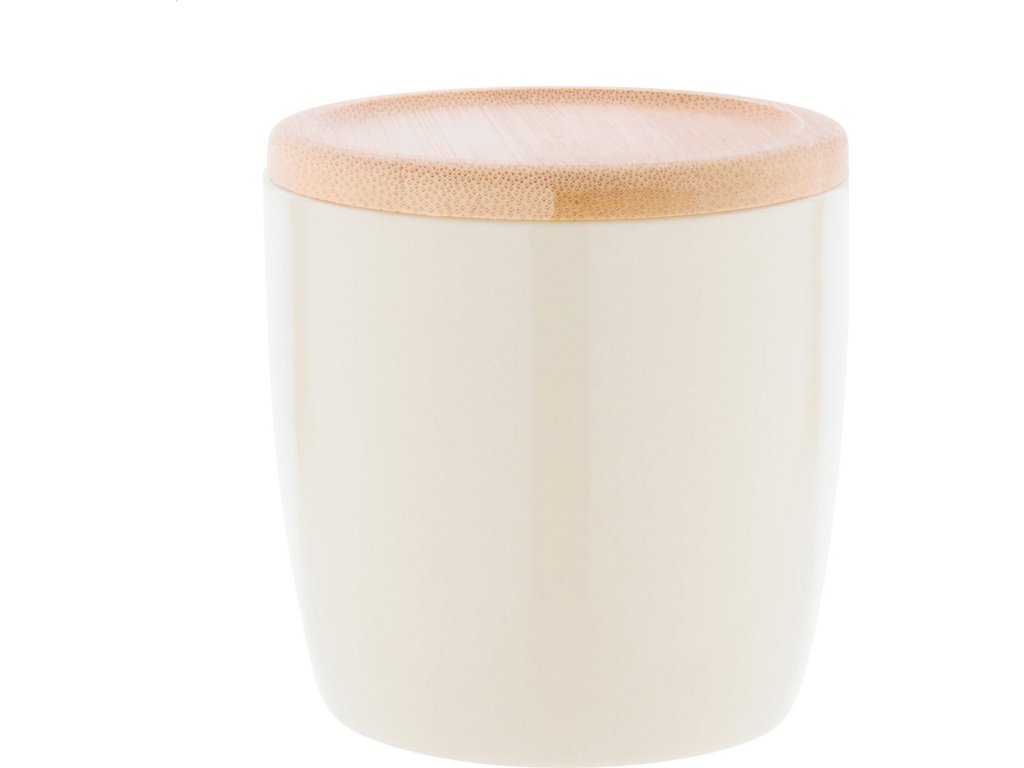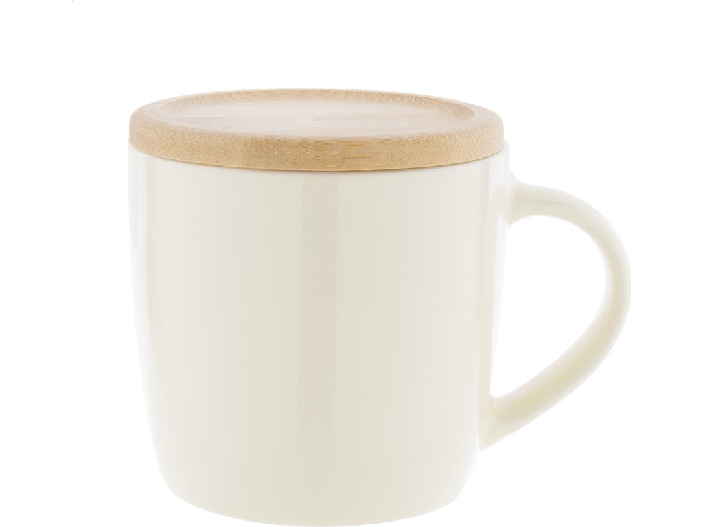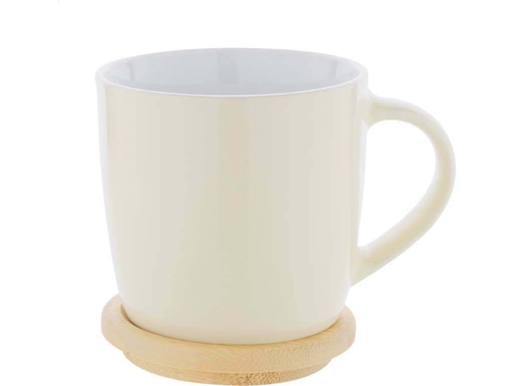 Vysoce kvalitní barevný keramický hrnek s bílým vnitřkem a bambusovým podtáckem, 370 ml. V kraftové papírové krabici.