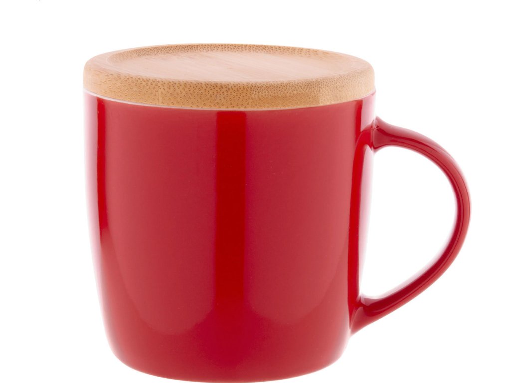 Vysoce kvalitní barevný keramický hrnek s bílým vnitřkem a bambusovým podtáckem, 370 ml. V kraftové papírové krabici.