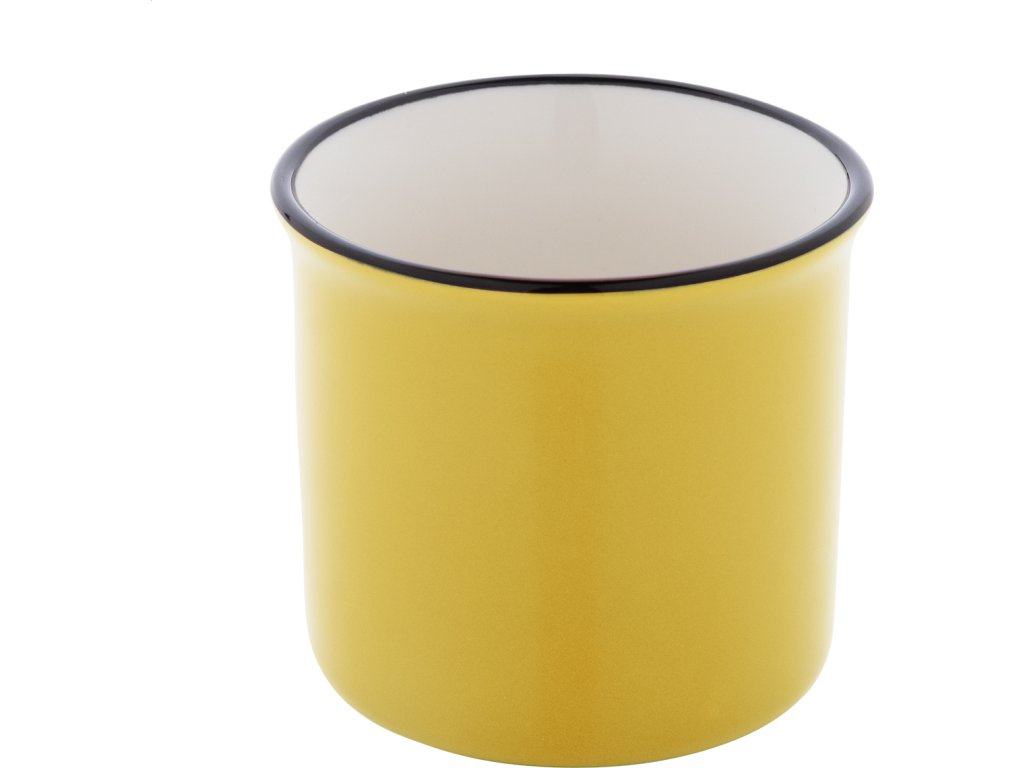Mini vintage keramický hrnek s černým okrajem, bílým uvnitř a barevným vnějškem, 90 ml. V krabičce z kraftového papíru.