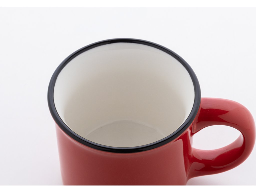 Mini vintage keramický hrnek s černým okrajem, bílým uvnitř a barevným vnějškem, 90 ml. V krabičce z kraftového papíru.