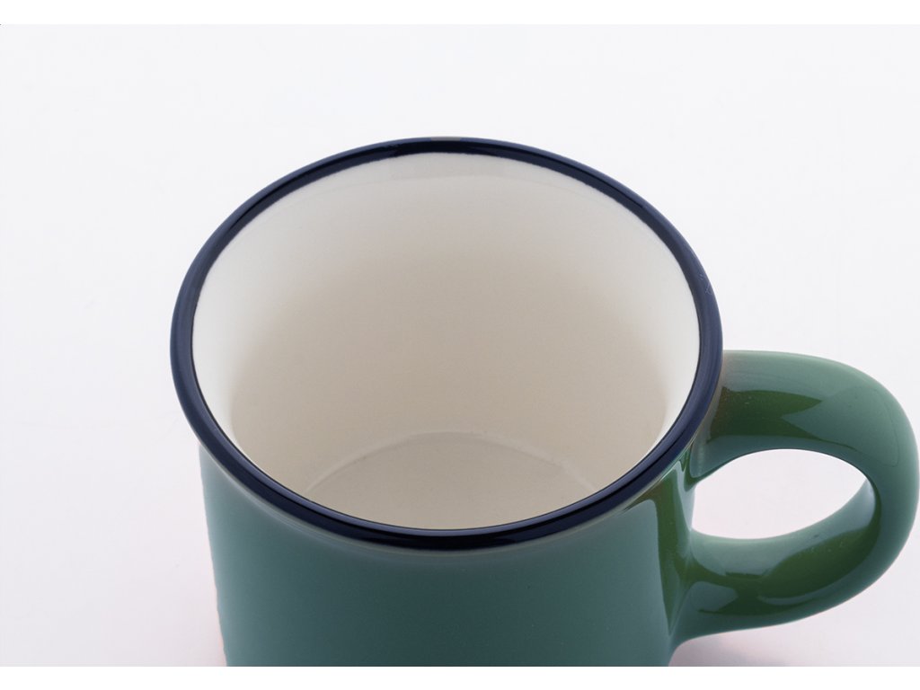 Mini vintage keramický hrnek s černým okrajem, bílým uvnitř a barevným vnějškem, 90 ml. V krabičce z kraftového papíru.