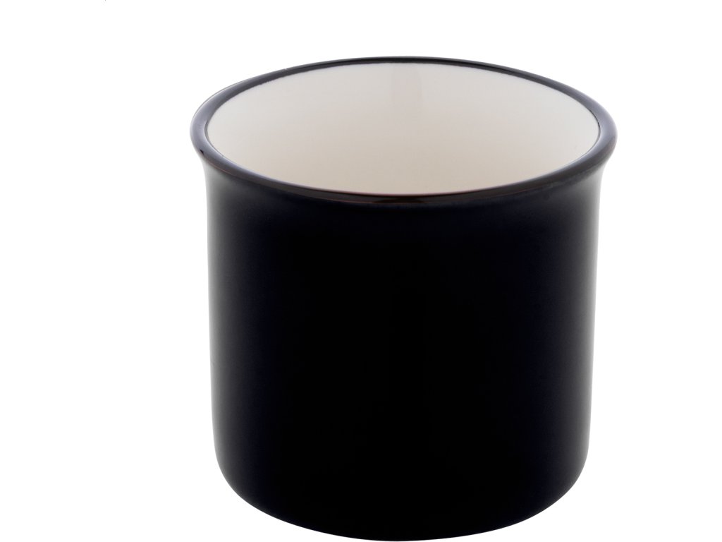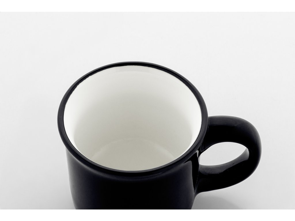 Mini vintage keramický hrnek s černým okrajem, bílým uvnitř a barevným vnějškem, 90 ml. V krabičce z kraftového papíru.
