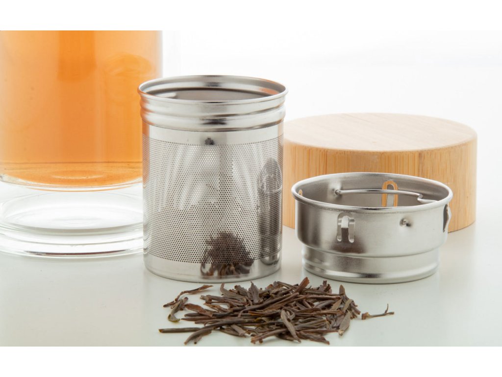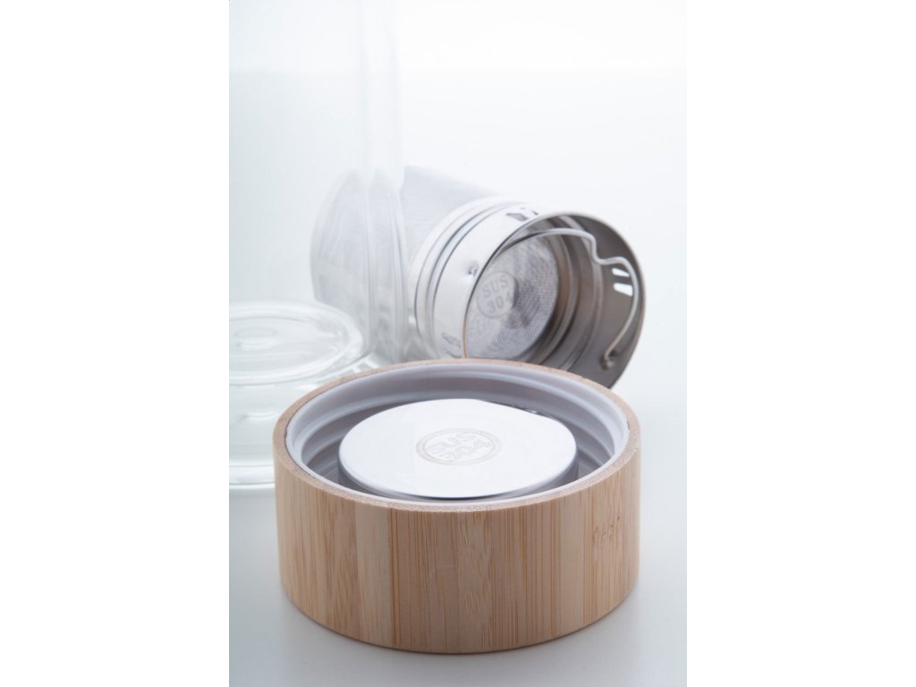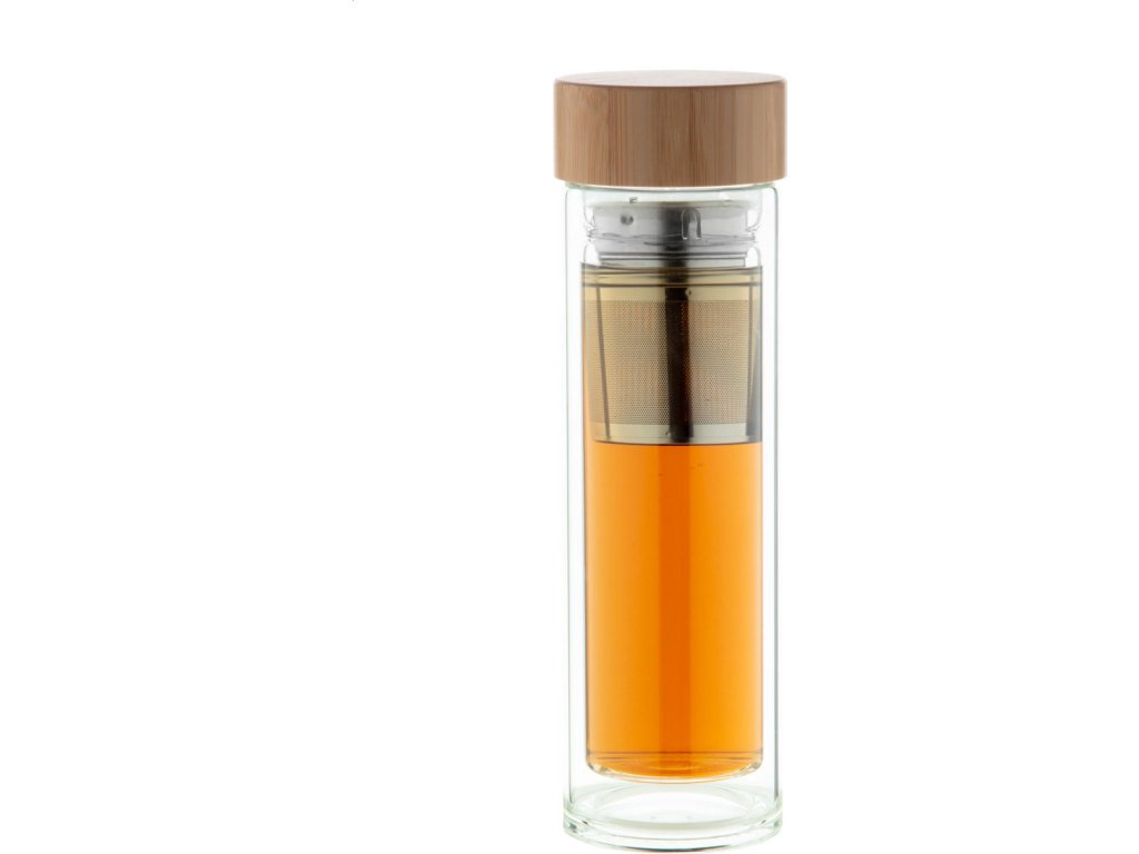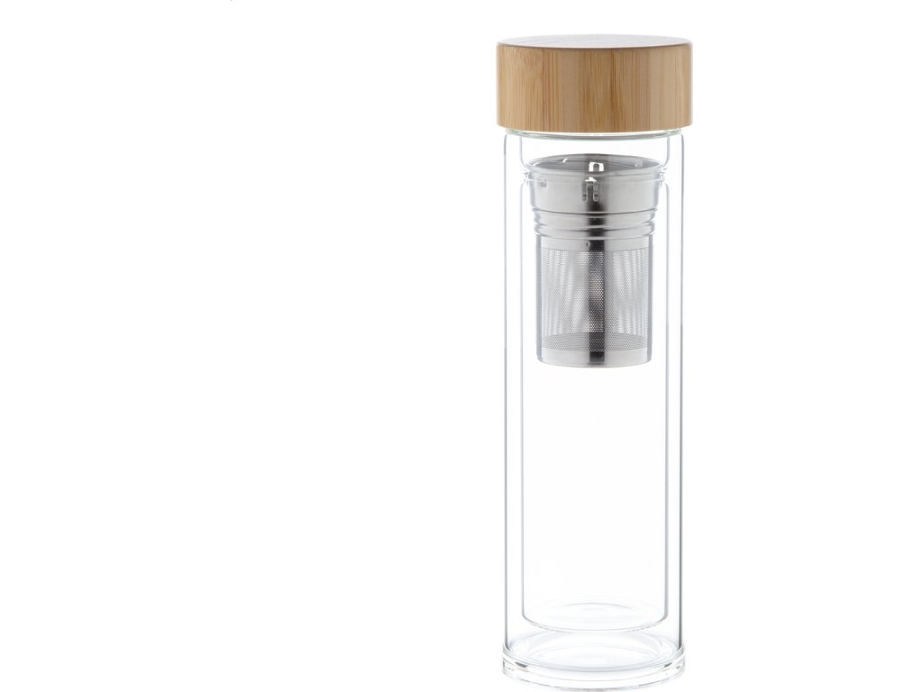 Dvoustěnná, izolovaná láhev z borosilikátového skla s čajovým spařovačem a bambusovým víčkem. 420 ml.