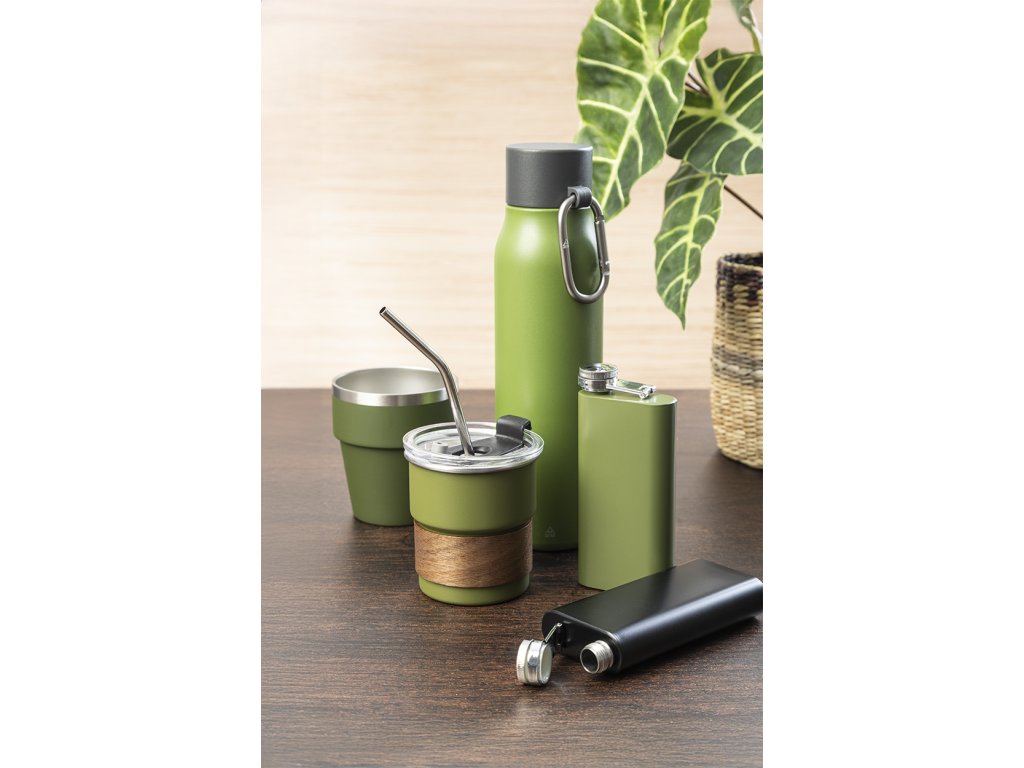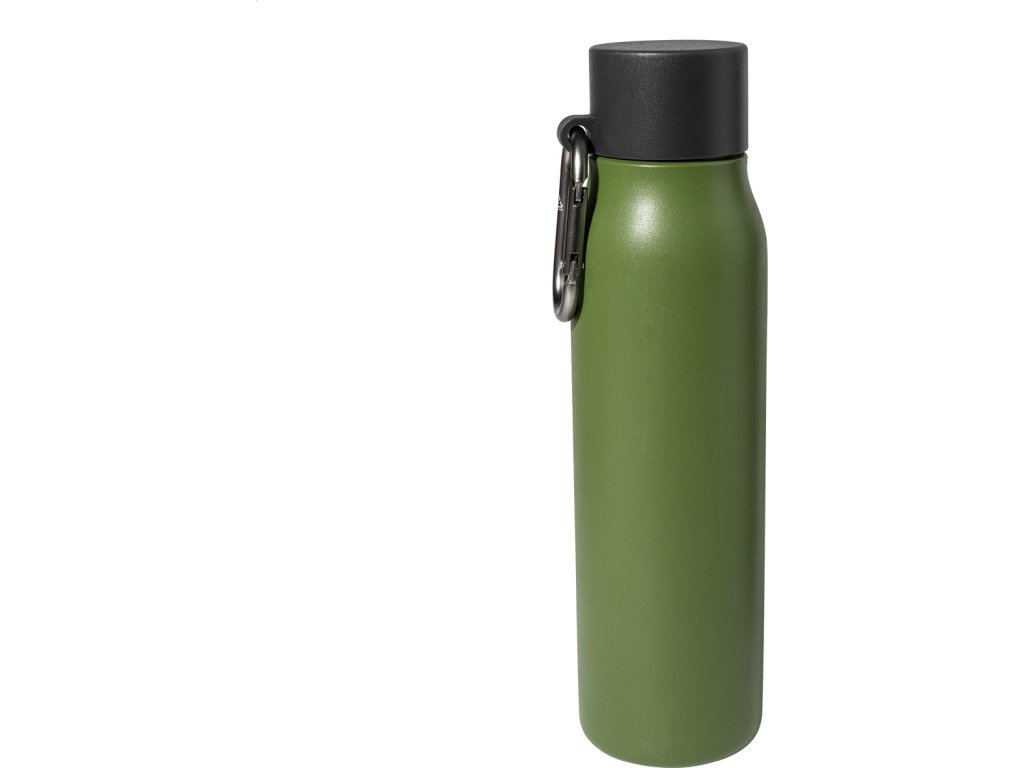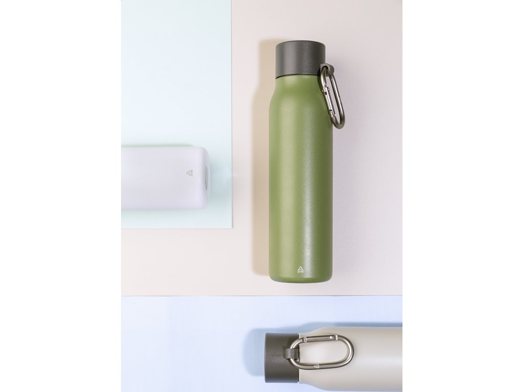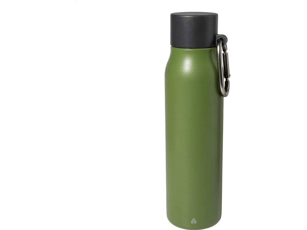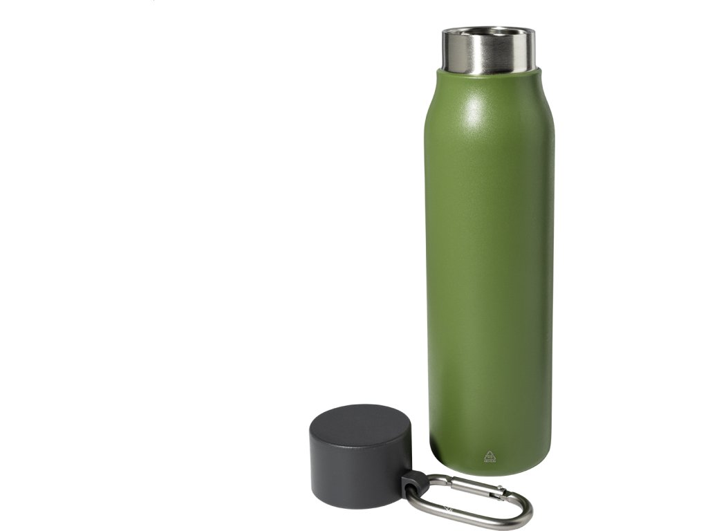 Dvoustěnná vakuová láhev z recyklované nerezové oceli s víčkem z PP a karabinou z recyklovaného hliníku. 500 ml.