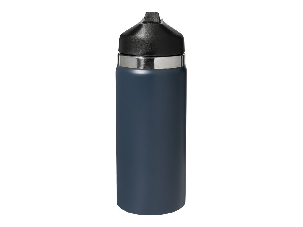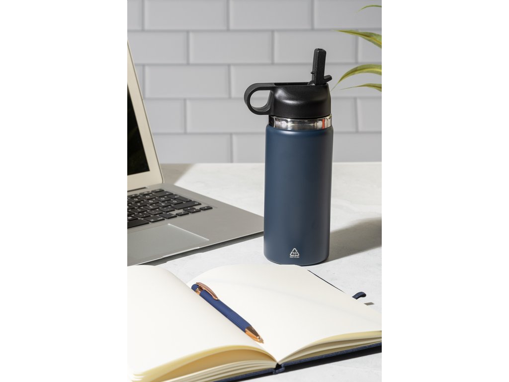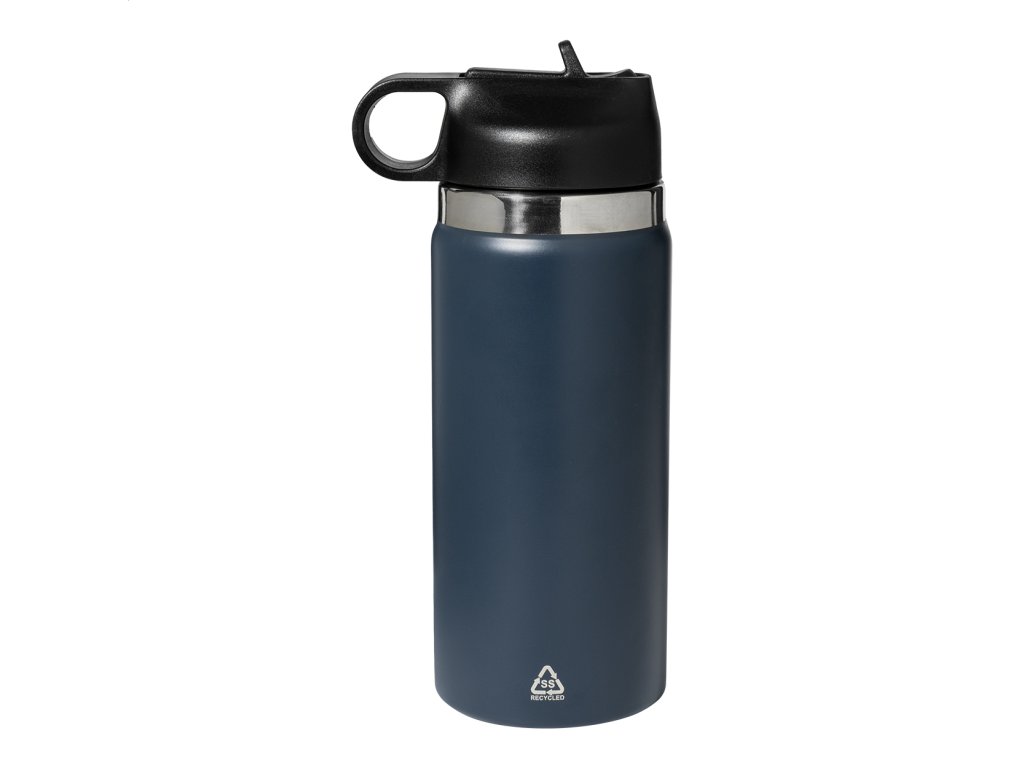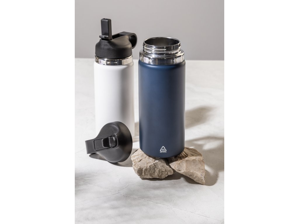 Dvoustěnná vakuová láhev z recyklované nerezové oceli s odklápěcím víčkem z PP, rukojetí a integrovaným brčkem. 500 ml.
