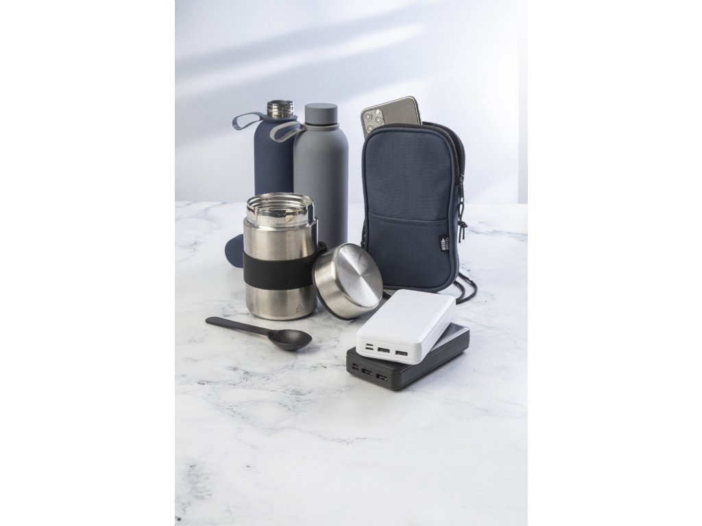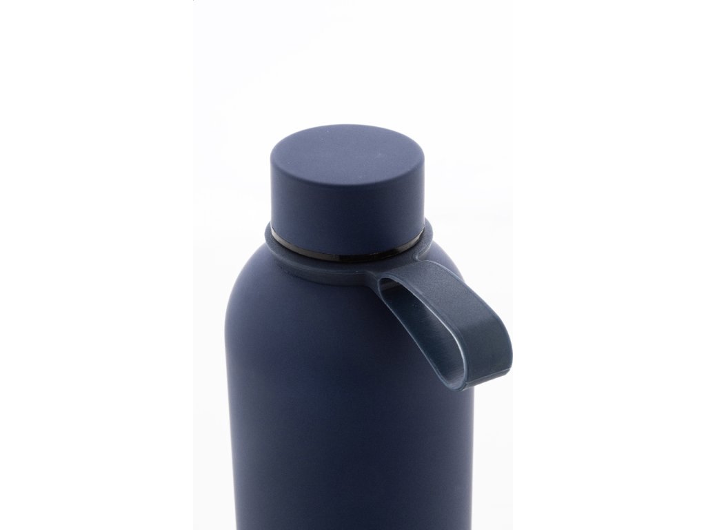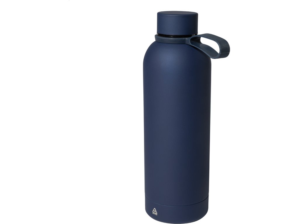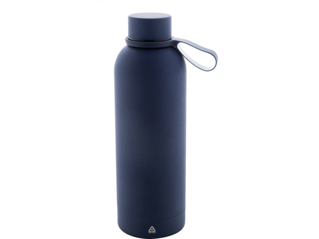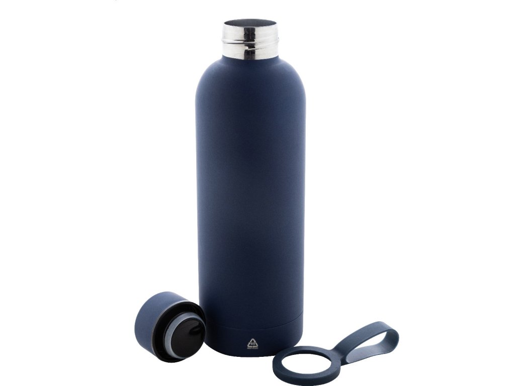 Dvoustěnná vakuová láhev z recyklované nerezové oceli s pogumovanou úpravou a silikonovým páskem, 500 ml.