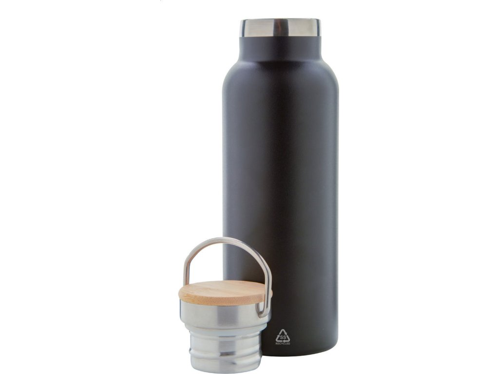 Dvoustěnná vakuově izolovaná termoska z recyklované nerezové oceli s bambusovým víčkem. 500 ml.