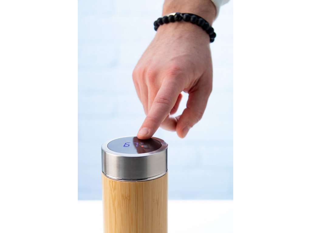 Dvoustěnná nerezová a bambusová termoska s čajítkem a dotykovým LED teploměrem na víčku. 500 ml. S knoflíkovou baterií.