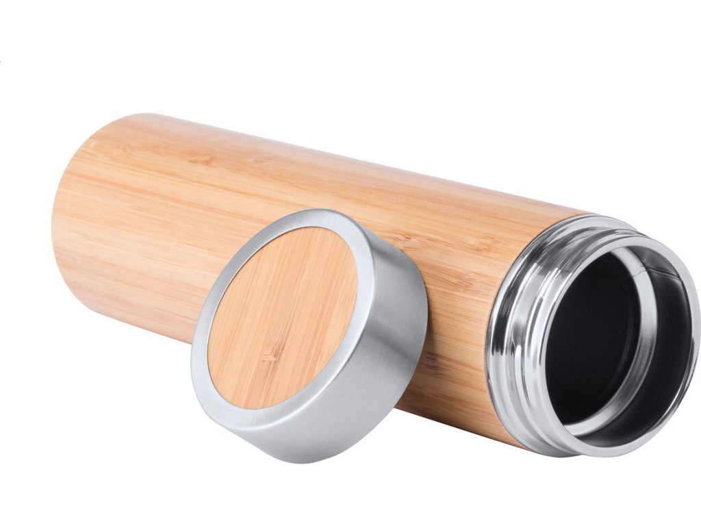 Dvoustěnná izolovaná termoska z nerezové oceli a bambusu. 500 ml.