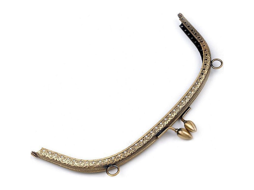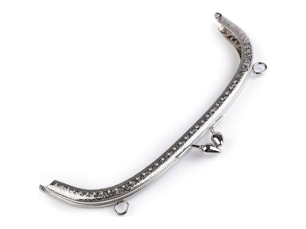 Kovový rámeček se zapínáním je určený na výrobu kabelky. Zapínání má nahoře úchyty na ucha. Rámeček je určený k našití, kdy se látka dovnitř vloží a ručně přešije přes dírky, jejichž rozpětí je 6 mm. Dírky jsou jen na vnější straně rámečku, která je delší než vnitřní, tudíž je našívání jednodušší. Tento typ zapínání využijete určitě na jakýkoliv typ kabelky, ať už společenské nebo určené ke všednímu nošení. Vnitřní rozměry rozvoru jsou 18,5 x 12,5 cm. Vnější rozměry rozvoru jsou 20,5 x 14,5 cm. Výška zavřeného rámečku je 7,5 cm (10 cm včetně zapínání).