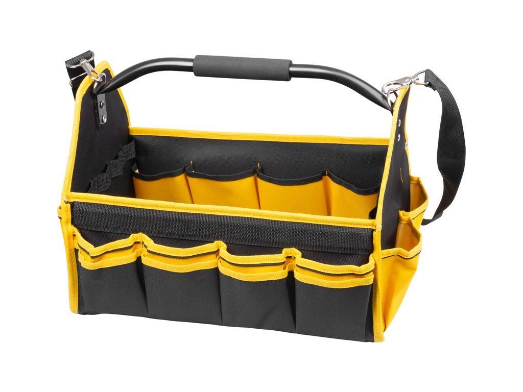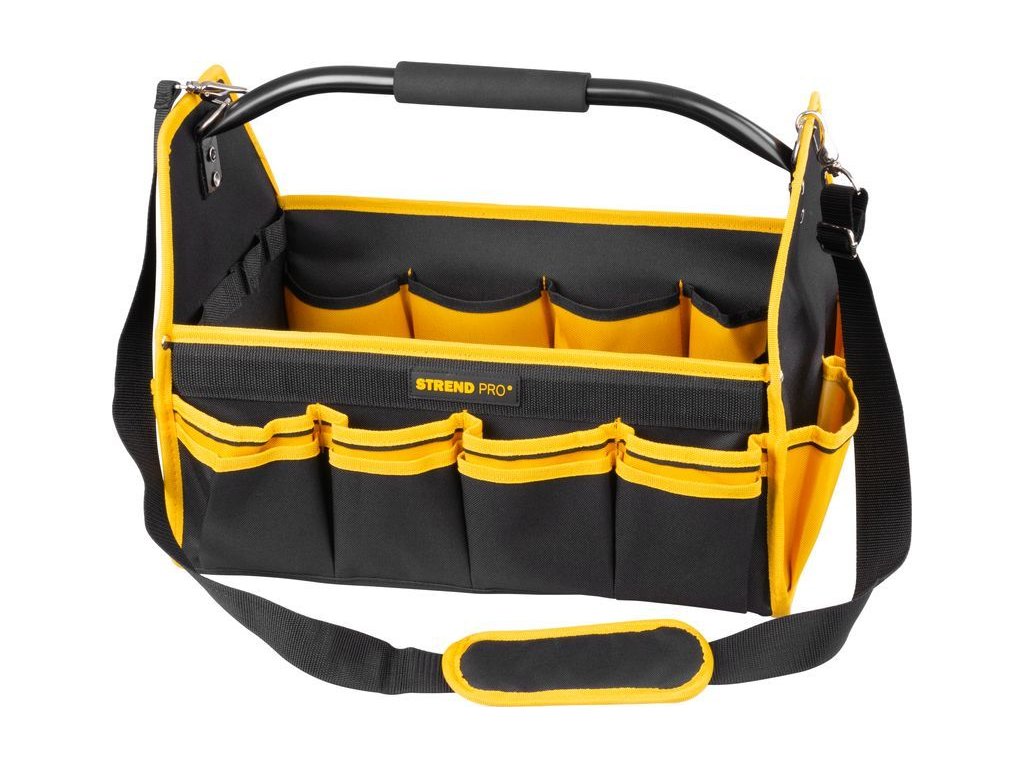 Praktická brašna Strend Pro na těžké nářadí je praktickým pomocníkem pro každého mistra a kutila. Obsahuje množství bočních kapes pro uložení menšího nářadí. Připojitelný ramenní popruh pro komfortní přenášení. Maximální nosnost: 20 kg. Rozměry: 45x28x33 cm.