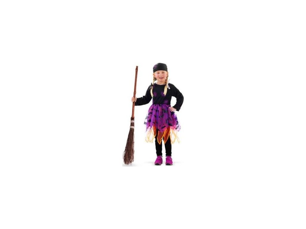 Dětský karnevalový kostým čarodějnice v černo-fialovém provedení, zdobený pavučinkou s netopýry. Ve velikosti S je určen pro holčičky ve věkovém rozmezí 3-5 let (98-116 cm). Součástí balení jsou šaty a šátek.