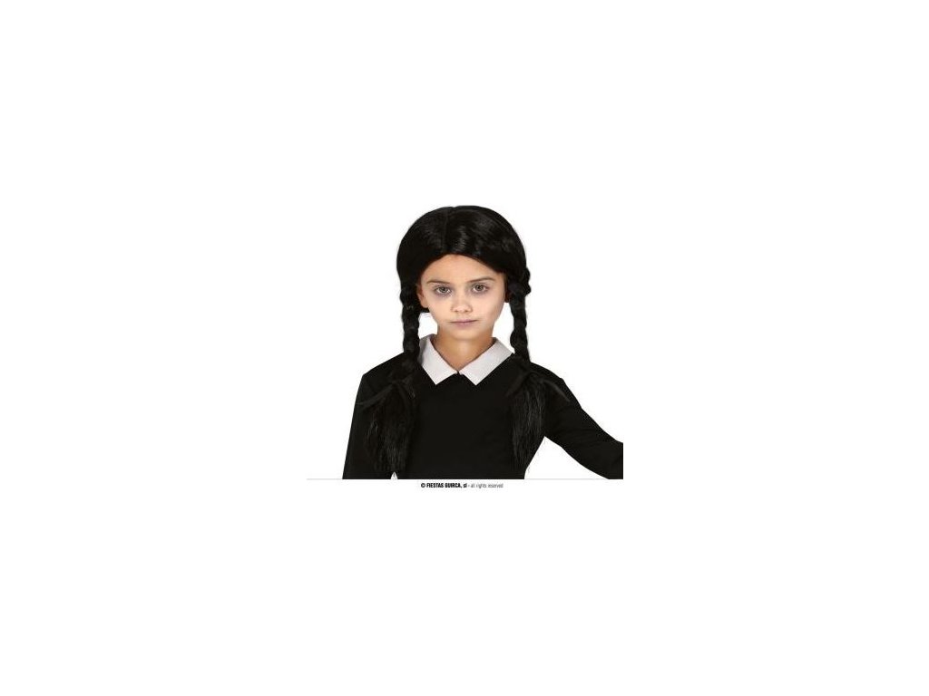 Krásná paruka černá s copy ve podobném stylu postavy Wednesday, která doplní Váš karnevalový kostým!