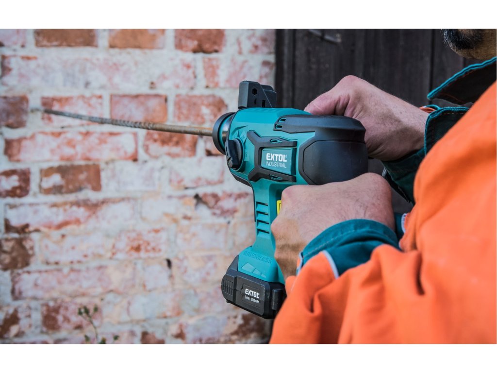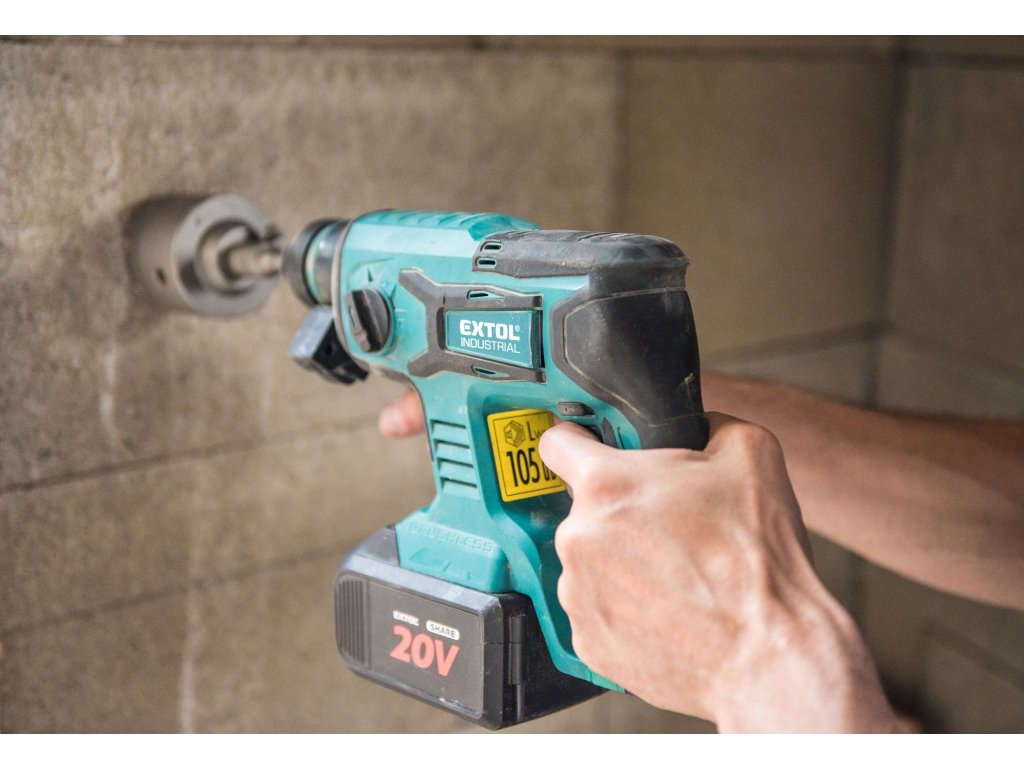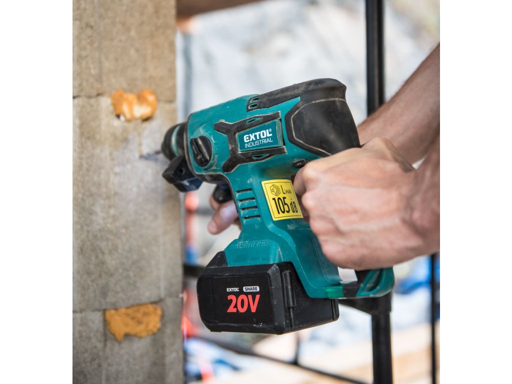 Aku vrtací kladivo je určeno k rychlému vrtání do cihel a betonu pomocí vrtáků s SDS plus stopkou a menším sekacím pracem. Kladivo je poháněno nejmodernějším „brushless" motorem. Tento nový typ motoru má vyšší životnost, je výkonnější a má menší spotřebu el. energie než klasické motory s uhlíkovými kartáči. Díky pneumatickému příklepovému systému je schopno vrtat mnohem rychleji a efektivněji než příklepové vrtačky. Kladivo má zámek sekáče, takže si můžete před sekáním sekáč nastavit do patřičné polohy a při sekání bude kladivo udržovat sekáč v této poloze. Jeho hlavní výhodou je akumulátorový pohon, který dovoluje si vzít kladivo s sebou tam kde s ním potřebujete pracovat, bez ohledu na to, jestli tam je rozvod elektrické energie. Kladivo je vybaveno zpětným chodem pro snadné vytažení zaseklého vrtáku a regulací rychlosti, kterou lze využít dle vrtaného materiálu. Integrované LED osvětlení má zpožděné vypnutí a svítí ještě několik vteřin po vypnutí kladiva. Pro běžnou práci dostačují jeden nebo dva 2000mAh akumulátory, které můžete rychle nabít v rychlonabíječce, pro náročnější nebo delší práci doporučujeme větší akumulátory s kapacitou 4000–8000mAh. Akumulátor lze použít ve všech typech nářadí řady EXTOL SHARE20V. Díky použité Li-ion technologii je ho možné kdykoliv dobíjet, aniž by se tím snižovala jeho kapacita. Li-ion akumulátor ztrácí energii vlivem samovybíjení velmi pomalu a vydrží dlouho nabitý a připravený k použití.