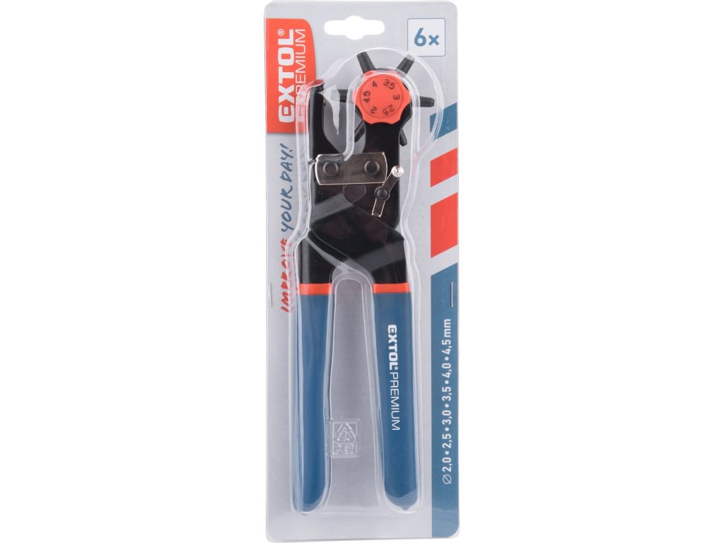 Děrovací kletě Extol Premium. Kvalitní děrovací kletě s otočným děrovačem, které dovolují děrovat v měkkých materiálech, jako je kůe, PVC, těsnící papír tvrdé lepenky a podobně. Technické specifikace: - Délka: 220mm - Počet děrovačů: 6 - Průměr děrovačů: 2,0; 2,5; 3,3; 3,5; 4,0; 4,5mm