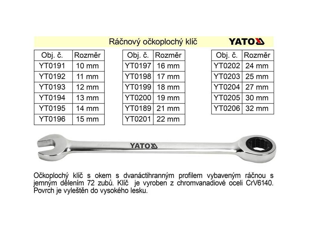 Ráčnový očkoplochý klíč Yato - na jedné straně klasický stranový klíč, na straně druhé očkový klíč s dvanáctihranným profilem vybaveným ráčnou s jemným dělením 72 zubů. Tělo klíče je vyrobeno z chromvanadiové oceli CrV6140. Povrch je vyleštěn do vysokého lesku.