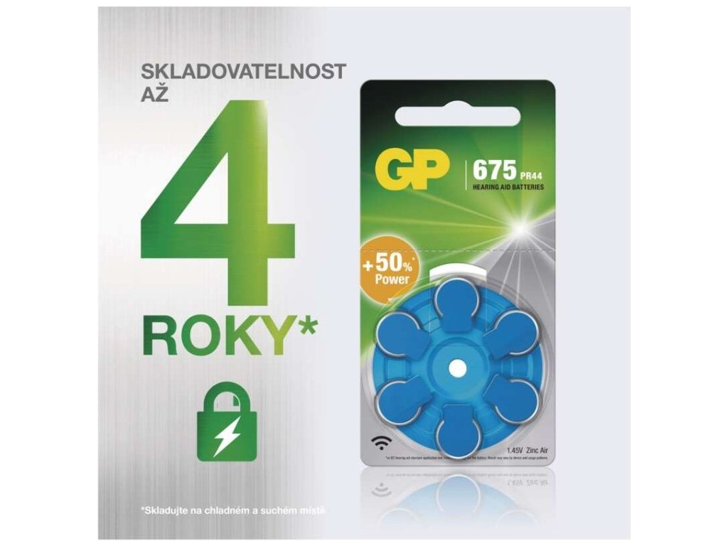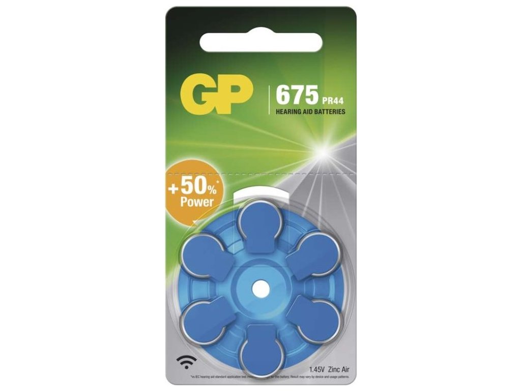 Baterie do naslouchadel GP ZA675 (PR44) Popis produktu Řada těchto zinkovzdušných baterií nachází hlavní uplatnění v medicínském oboru jako baterie do naslouchadel. Konstrukce a charakteristika baterie poskytuje maximální výkon pro stálé pracovní napětí při různých okolních teplotách, což je prvním krokem pro maximální spolehlivost baterie. Jejich doba skladování je až 3 roky a pracovní teplota -20 °C až +40 °C. Nejdůležitější parametry velikost baterie neuvádí se chemické složení zinkovzdušné kategorie/řada Hearing Aid možnost nabíjení ne Ostatní parametry kapacita 620 mAh (při zátěži 300 Ohm) napětí 1,45 V typ GP ZA675 (7003ZD, PR44) provozní teplota -10 °C až +50 °C počet nabíjecích cyklů nenabíjecí hmotnost 1,8 g max. skladovatelnost 3 roky značka GP rozměr 11,6 × 5,4 mm prodejní obal 6 ks, blistr