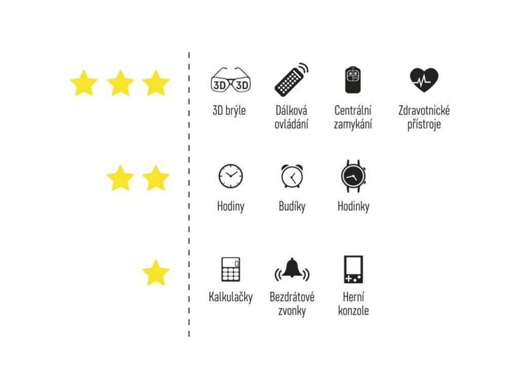 Široký rozsah provozních teplot od -10 °C do +60 °C. Vhodná pro citlivá zařízení jako např.: hodinky, kalkulačky, záložní podsvícení, autoalarmy, tlakoměry, dálkové ovladače a další. Extrémně dlouhá skladovatelnost až 10 let.