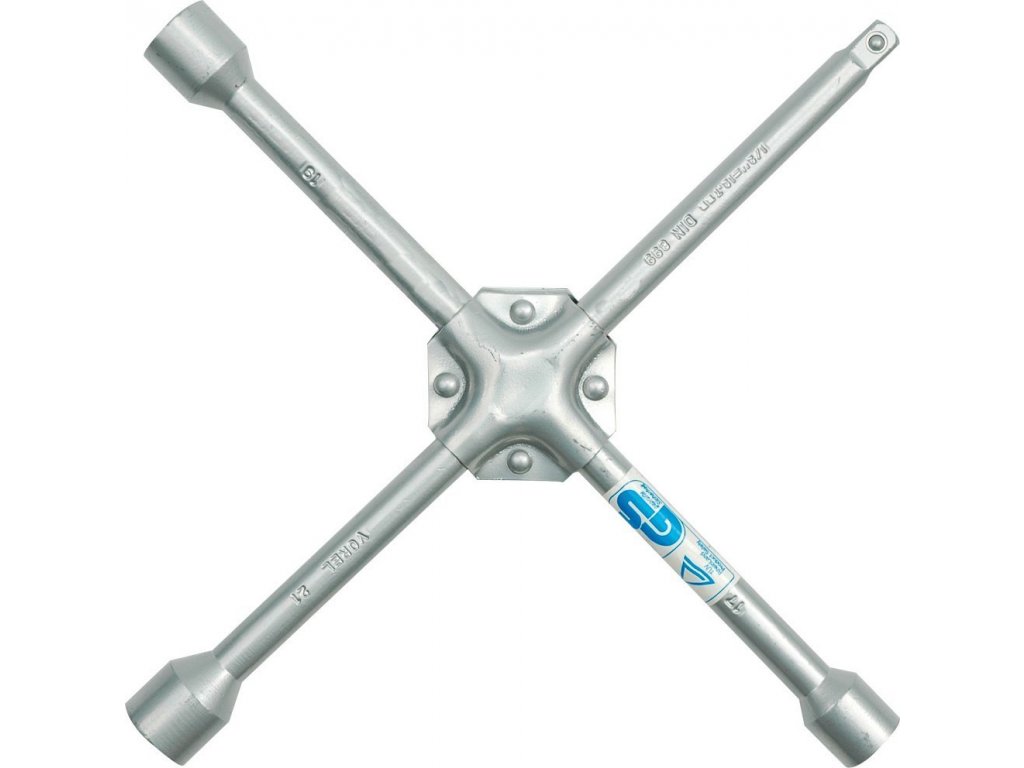 Celokovový klíč ve tvaru kříže, který je určen pro povolování či utahování matic kol automobilů.