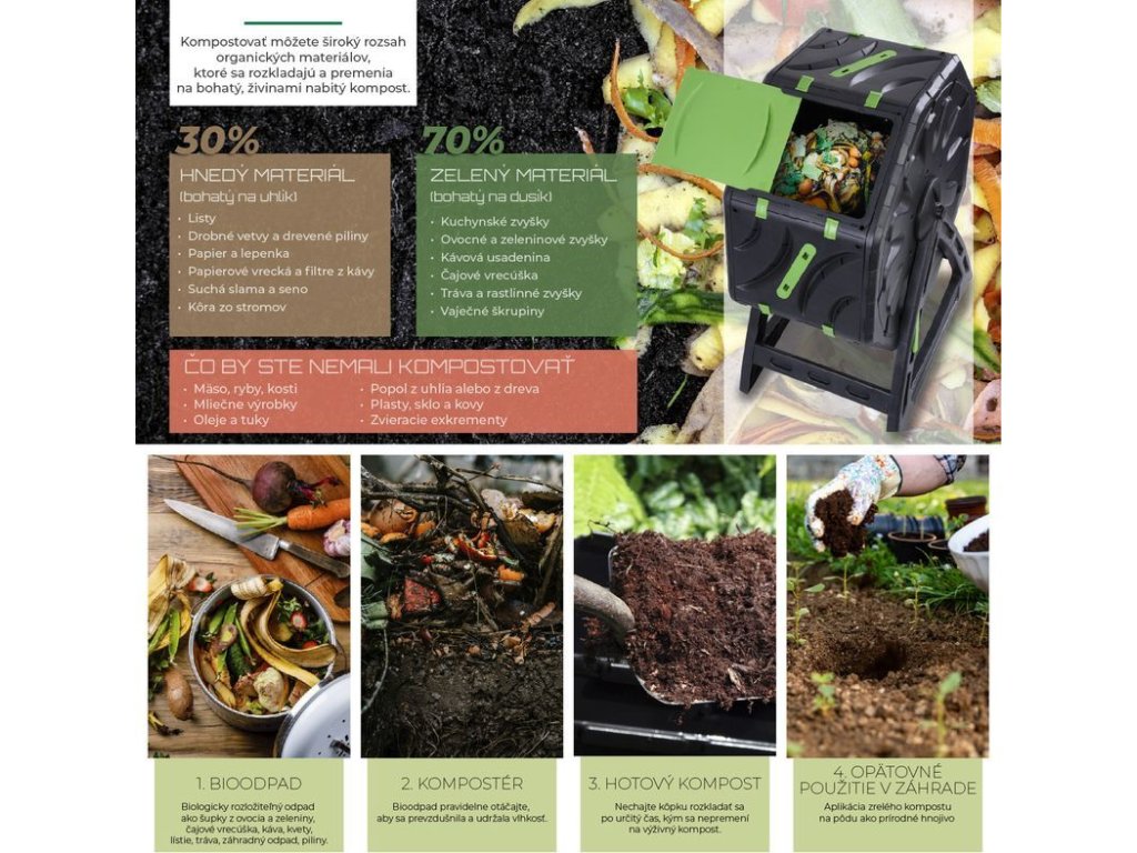 Stačí přidat kuchyňský odpad, posečenou trávu či jiné zahrádkářské zbytky rostlin a vytvoří se zdravý kompost vhodný k hnojení rostlin, ovoce a zeleniny.