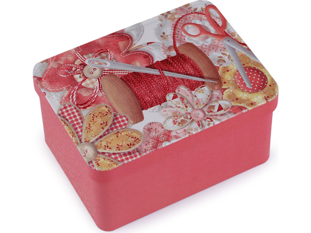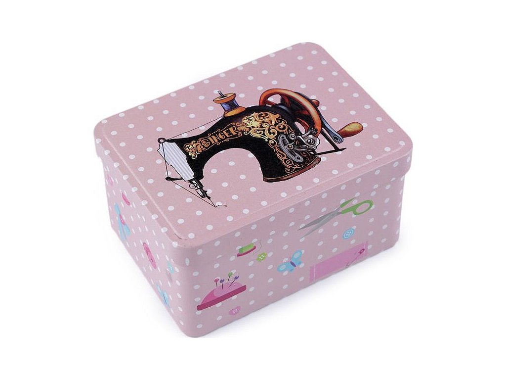 Plechovou krabičku využijete na drobnosti. Její švadlenkovský design ji předurčuje na uložení šicích potřeb jako jsou knoflíky, jehly, nitě, zkrátka všechny drobnosti, které švadlenka potřebuje. Víko je odklápěcí.