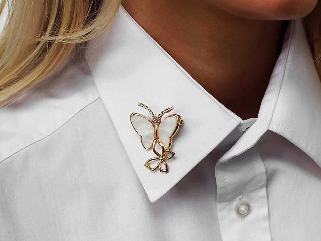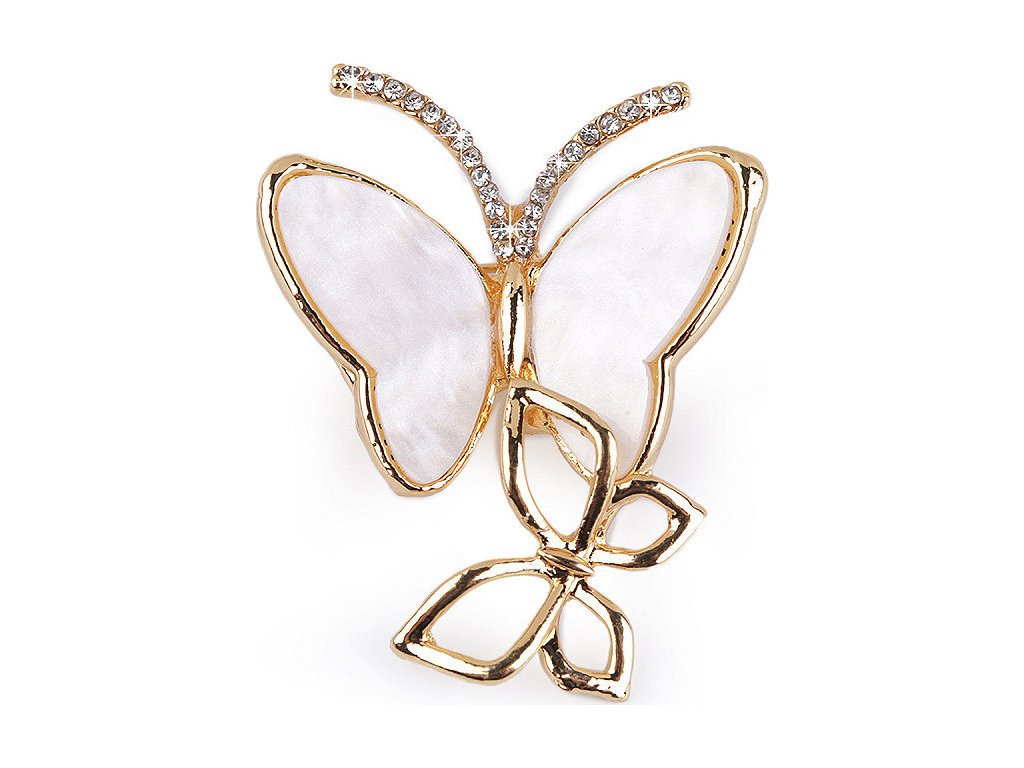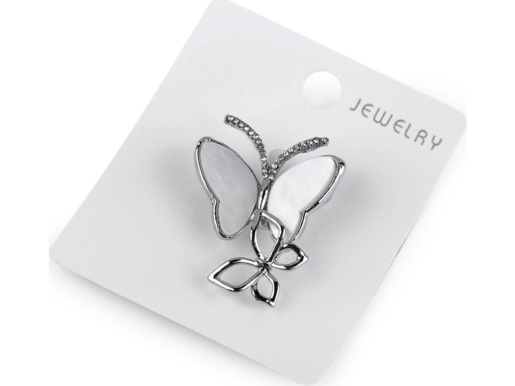 Brož dvou motýlů je elegantním módním doplňkem. Větší motýl má křídla ozdobená imitací perleti, tykadla má osázená drobnými broušenými kamínky, které se krásně třpytí. Zapíná se pomocí brožového špendlíku. Brož můžete nosit nejen na oděvech, ale hodí se i k ozdobení klobouků, tašky či sepnutí šátku. Je na plastové kartě, která se dá zavěsit na prodejní stojan.