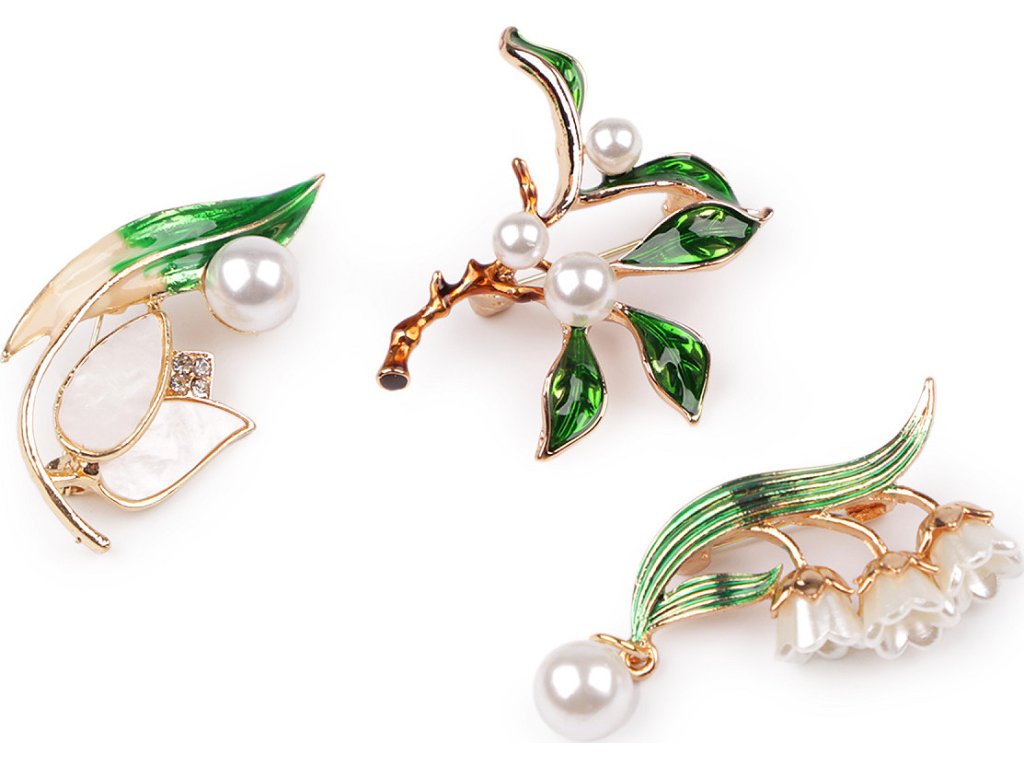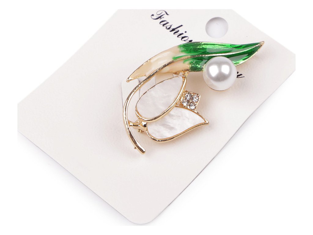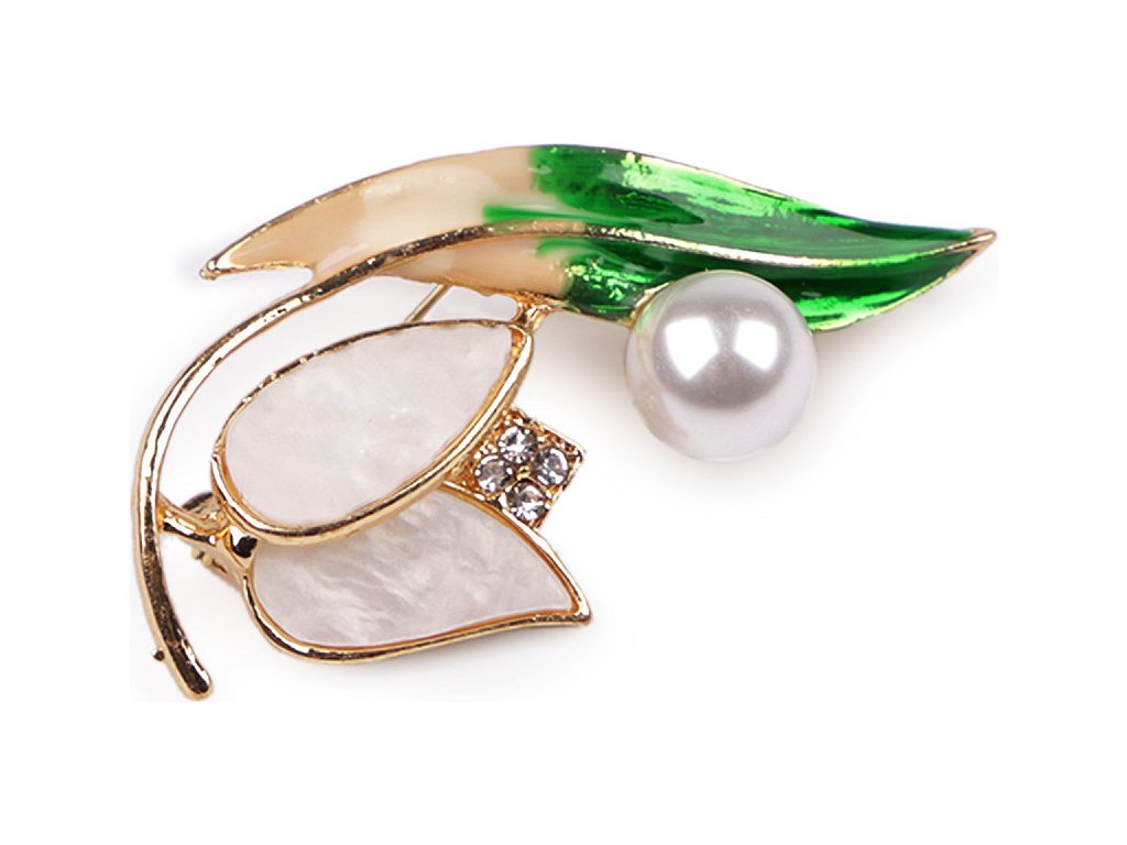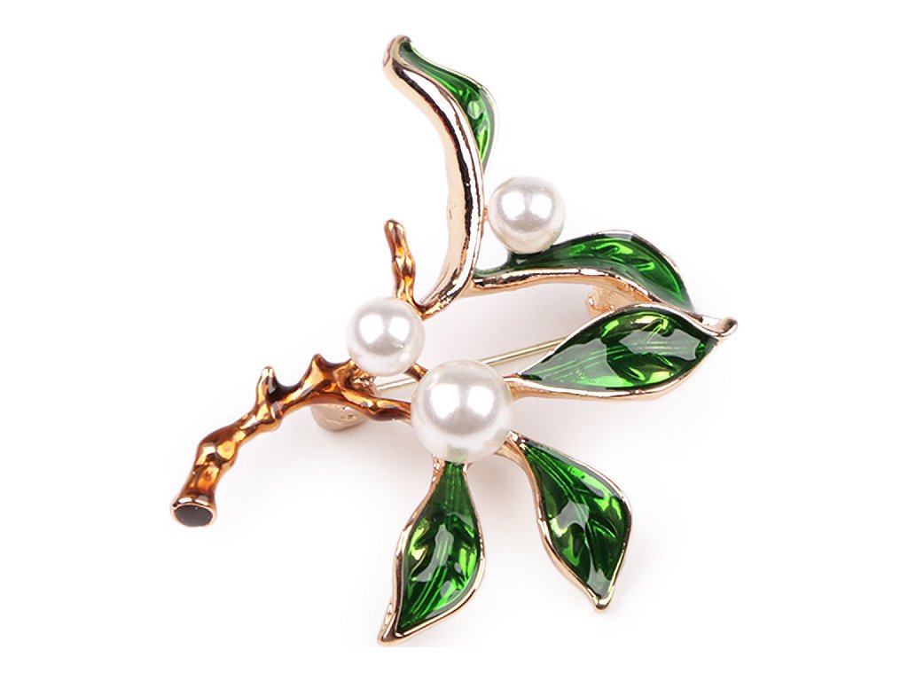 Elegantní brož s motivem rostlin bude perfektním doplňkem vašeho oděvu. Díky perlám a barevnému smaltu skvěle dozdobí halenky, šaty, saka, svetry, kabáty, kabelky či čepice. Hodí se i na ozdobné sepnutí šátku. Brož má vzadu brožový špendlík. Je na plastové kartě, která se dá zavěsit na prodejní stojany.