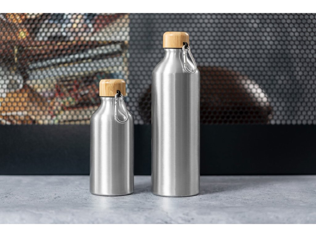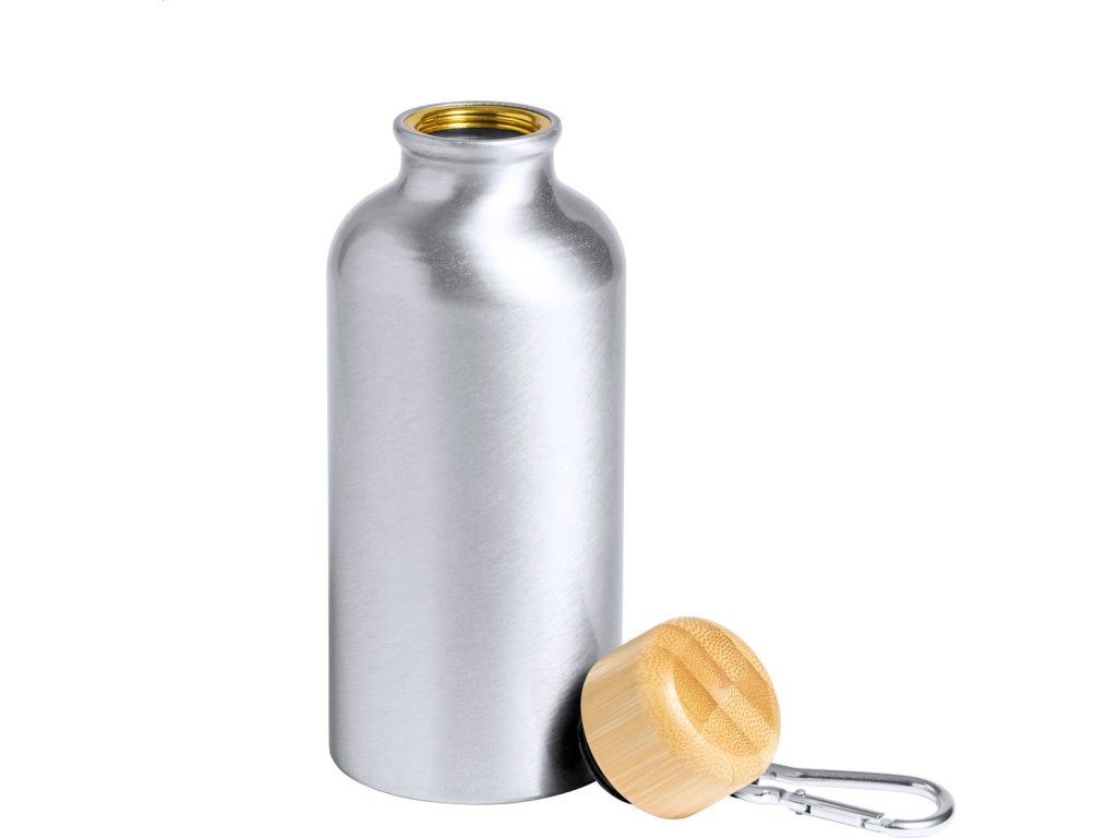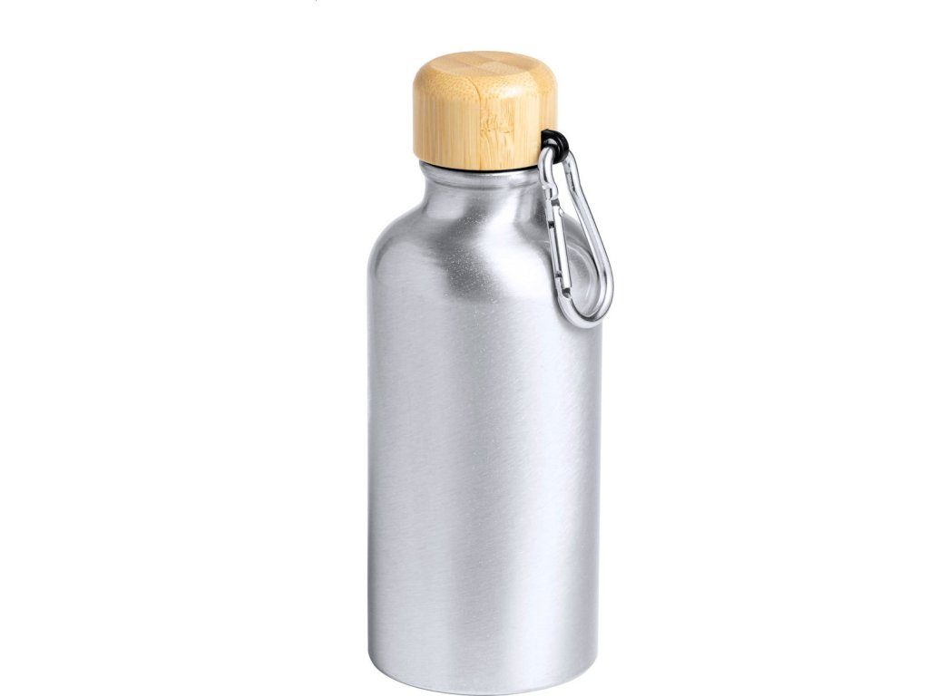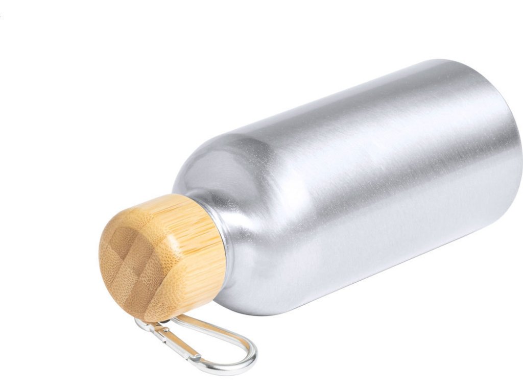 Hliníková sportovní láhev s bambusovým víčkem a karabinou, 400 ml. Není vhodná pro sycené nápoje.