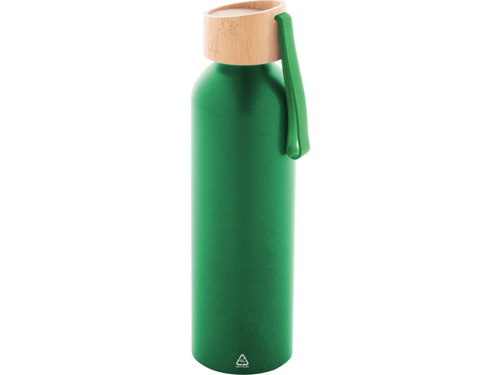 Láhev z recyklovaného hliníku s bambusovým víčkem a silikonovým popruhem v odpovídající barvě, 600 ml.