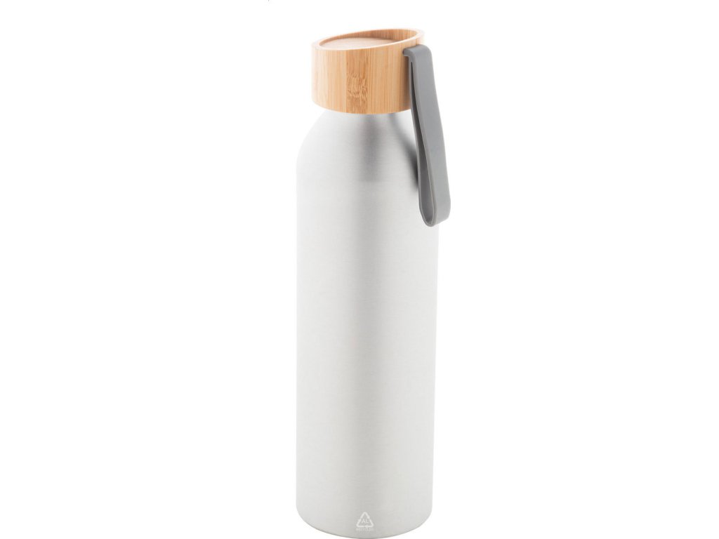 Láhev z recyklovaného hliníku s bambusovým víčkem a silikonovým popruhem v odpovídající barvě, 600 ml.
