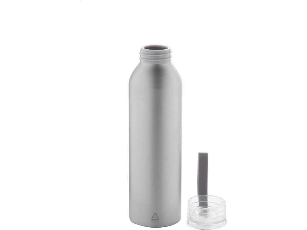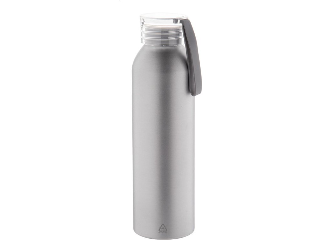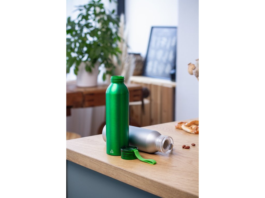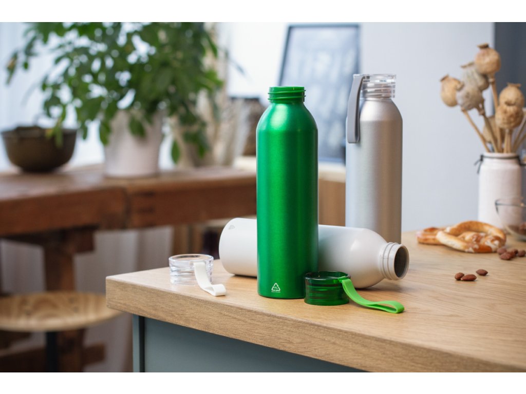 Láhev z recyklovaného hliníku s víčkem v odpovídající barvě a silikonovým popruhem, 600 ml.