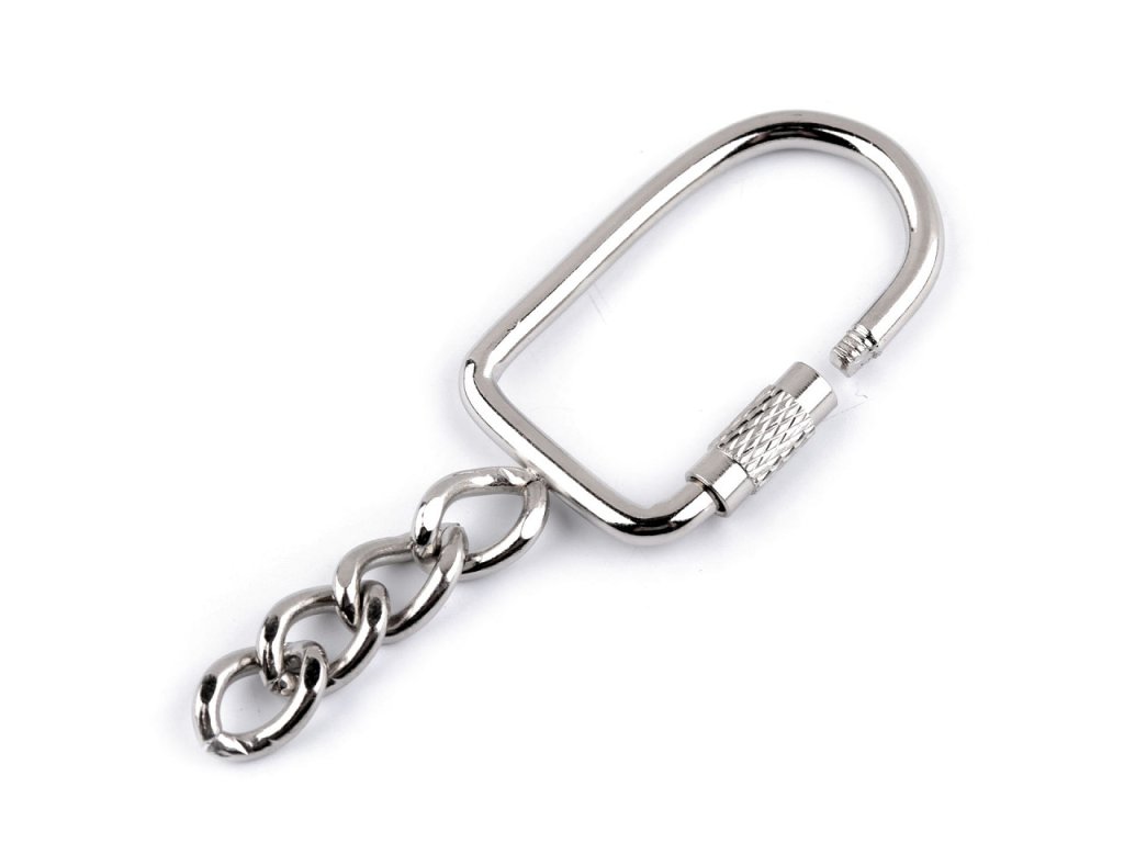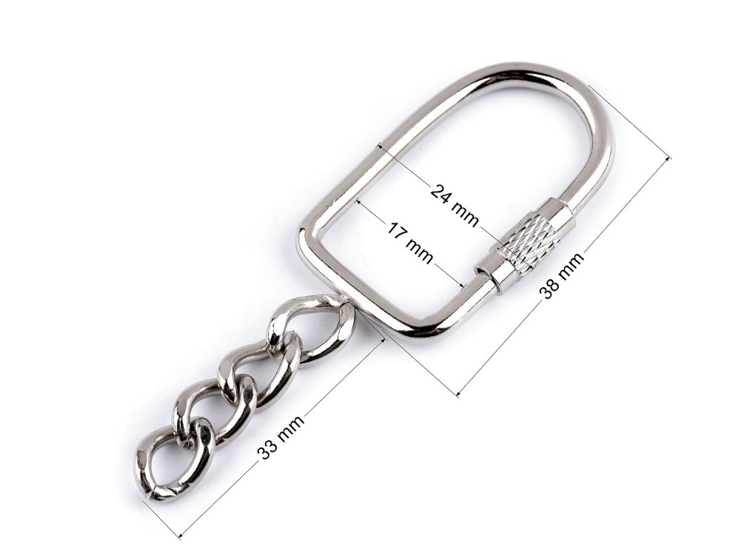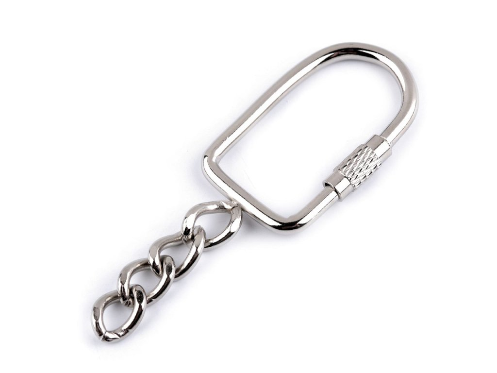 Kovová karabina s řetízkem má pojistku, díky které nehrozí, že se samovolně otevře. Karabinu můžete využít na výrobu klíčenek, k upevnění přívěsků apod.