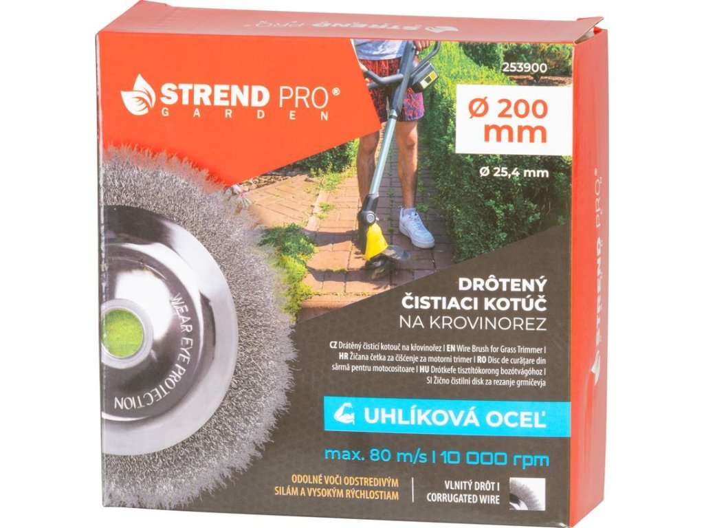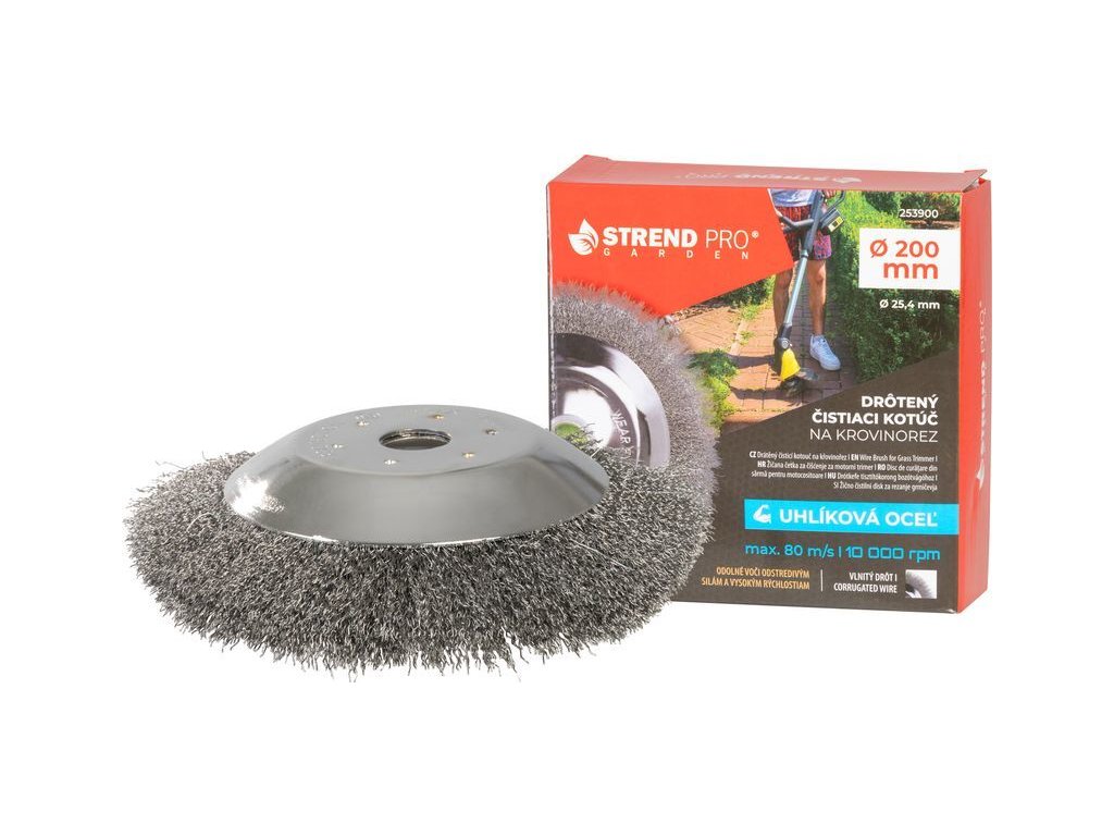 Drôtená hlava Strend Pro Gardenje výkonný čistiaci nadstavec na krovinorez určený na odstraňovanie buriny, machu, nečistôt a usadenín z betónových, kamenných a zámkových plôch. Vďaka priemeru200 mma montážnemu otvoru25,4 mmje kompatibilná s väčšinou bežných krovinorezov.