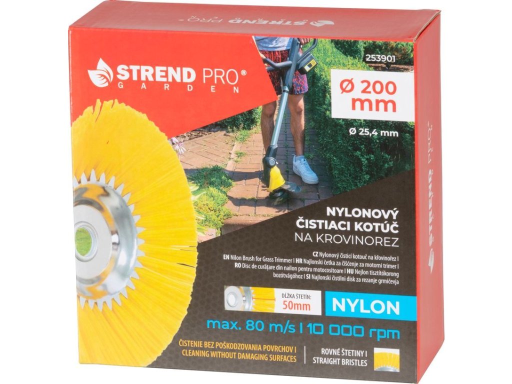 Tentonylonový kotúč s priemerom 200 mmje vhodný pre väčšinu krovinorezov so stredovým otvoromO 25,4 mm. Vysoká rýchlosť otáčania až10 000 ot./minpri maximálnej rýchlosti 80 m/s zabezpečuje účinný výkon aj pri náročnom používaní.