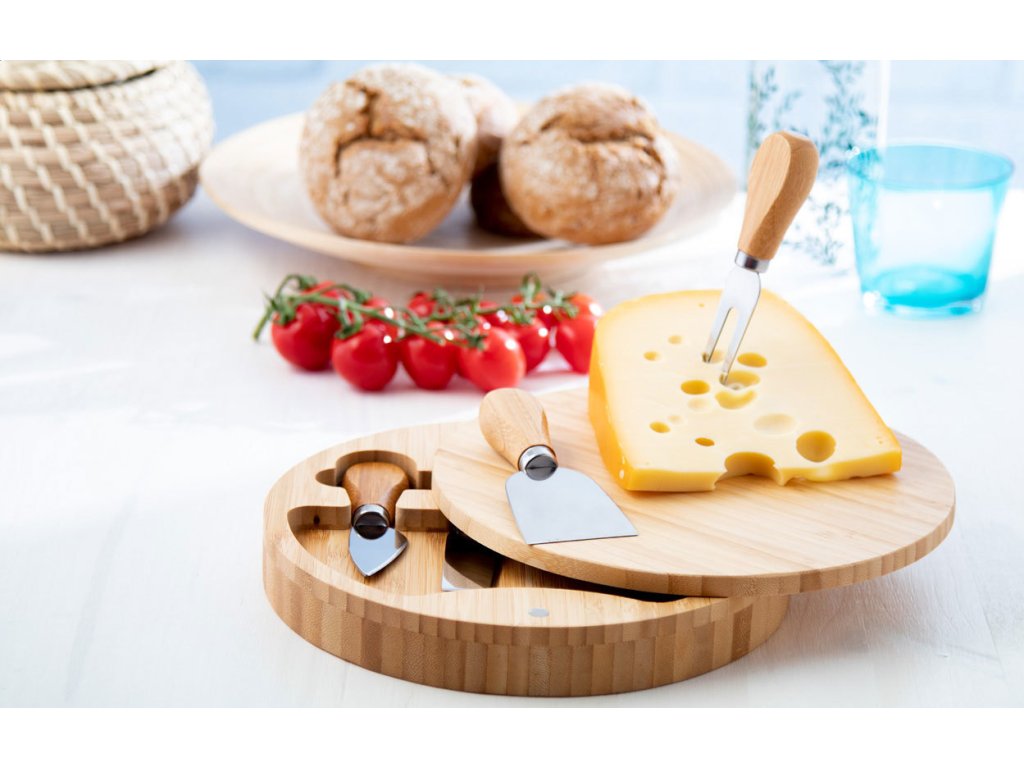 Kulaté bambusové prkénko se sadou nožů na sýr z nerezové oceli 4 ks.