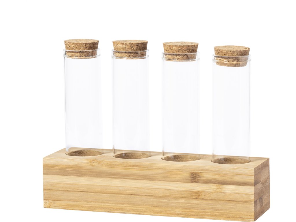 Sada 4 kusů skleněných kořenek z borosilikátového skla s víčky z přírodního korku a bambusovým stojánkem, 70 ml.