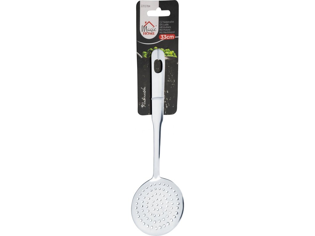Naběračka MagicHome je vhodná k vybírání pěny z polévky či brambor, ale zároveň skvěle slouží i k vybírání jídel při smažení a cedění při vaření, například knedlíčků, piroh, zeleniny atp. Je vyrobena z kvalitní nerezavějící oceli. Disponuje dírou na zavěšení. Rozměry: 33x7,7x3,4 cm.