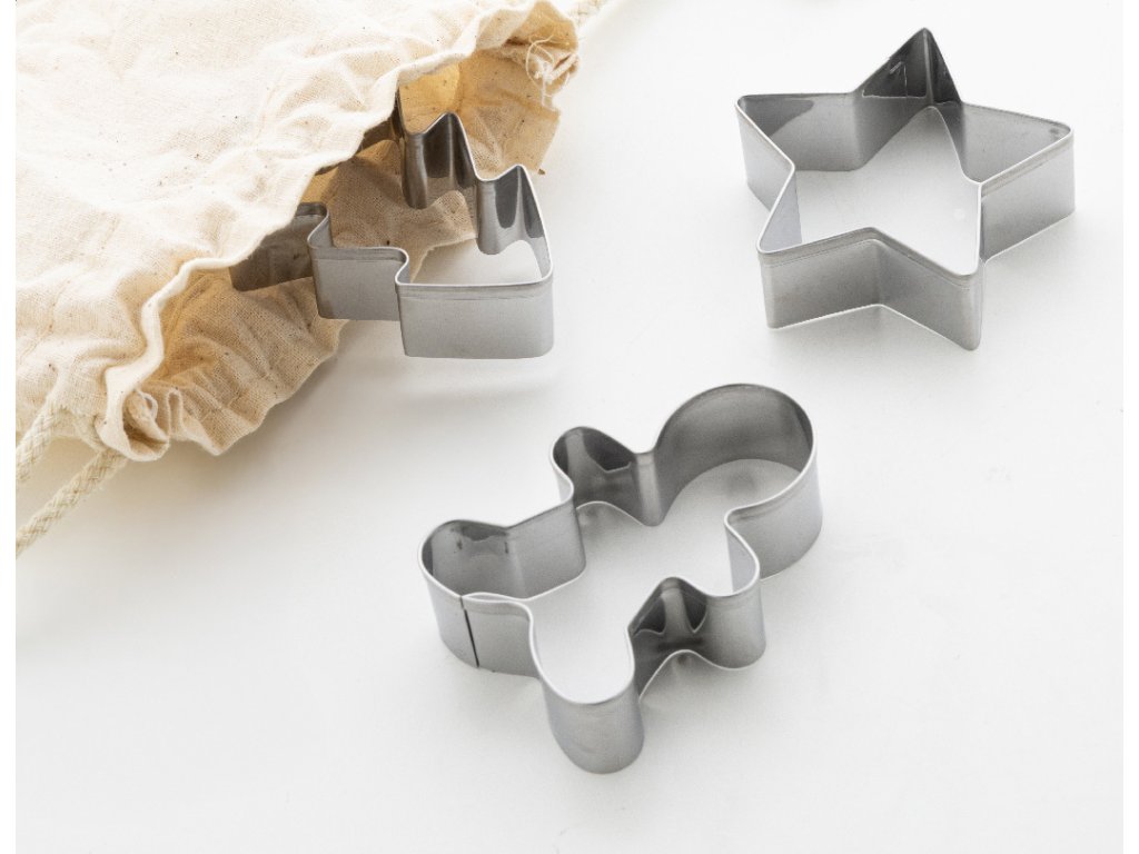 Sada 3 vykrajovátek na sušenky z nerezové oceli s vánočními tvary, v bavlněném pytlíku se stahovací šňůrkou.