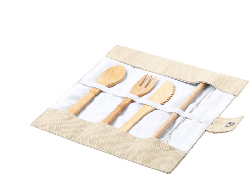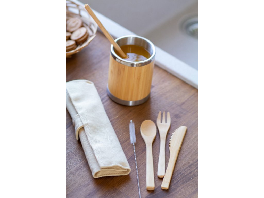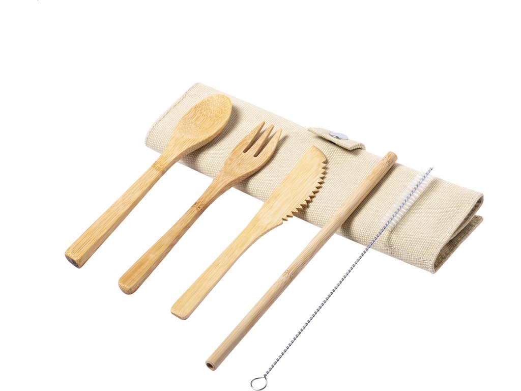 Sada 5 ks bambusových příborů v bavlněném pouzdře. Včetně vidličky, nože, lžíce, brčka na pití a čisticího kartáčku.